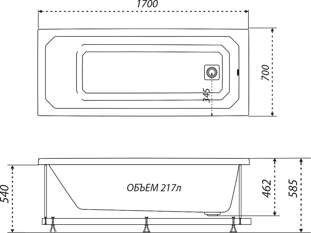 Акриловая ванна DIWO Элиста без опоры 170x70 см, пристенная, белая