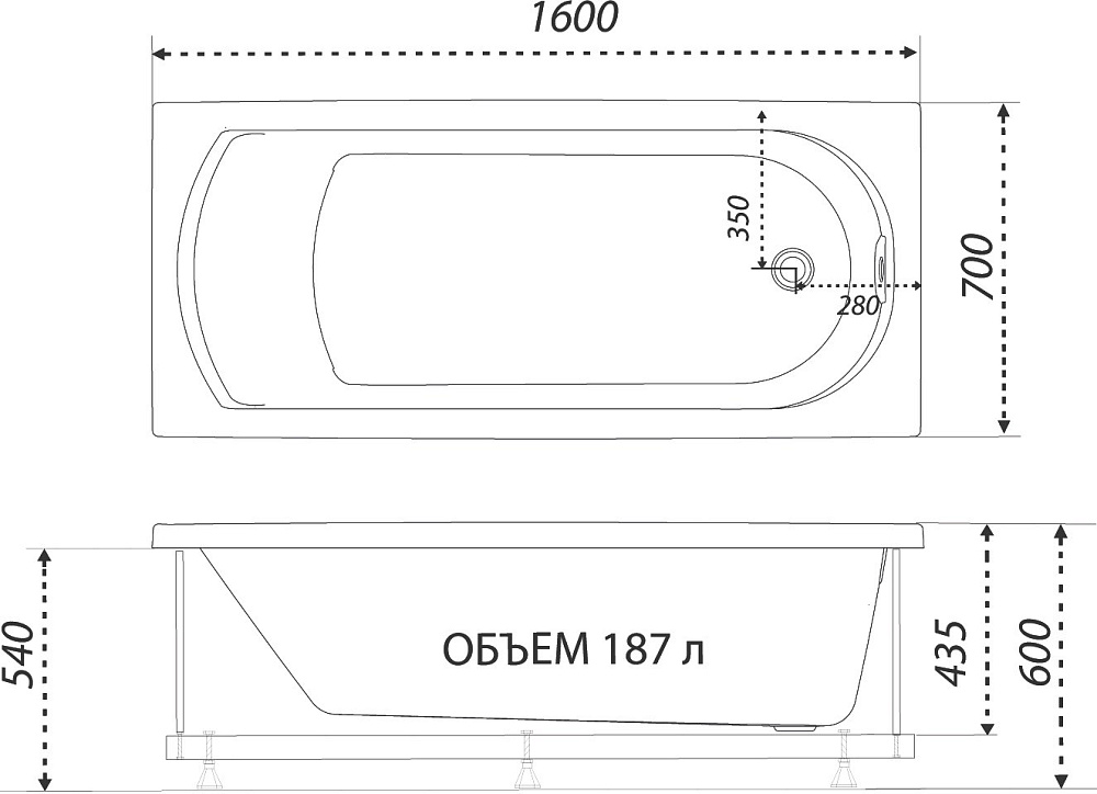 Акриловая ванна DIWO Углич без опоры 160x70 см, пристенная, белая