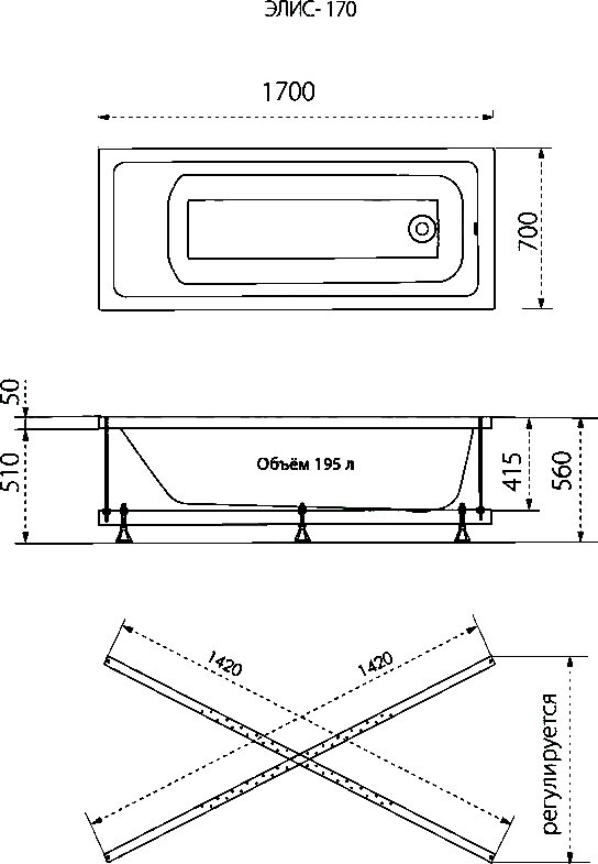 Акриловая ванна Triton Элис 170x70 см, пристенная, белая, с каркасом