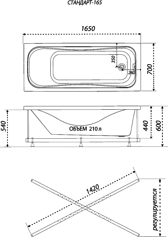 Акриловая ванна Triton Стандарт 165 Экстра 165x70 см, пристенная, белая, с каркасом