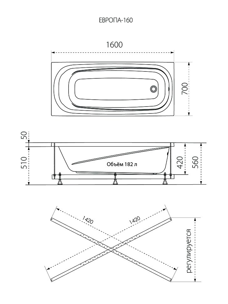 Акриловая ванна Triton Стандарт Европа 160x70 см, пристенная, белая, с каркасом, с экраном, со сливом-переливом