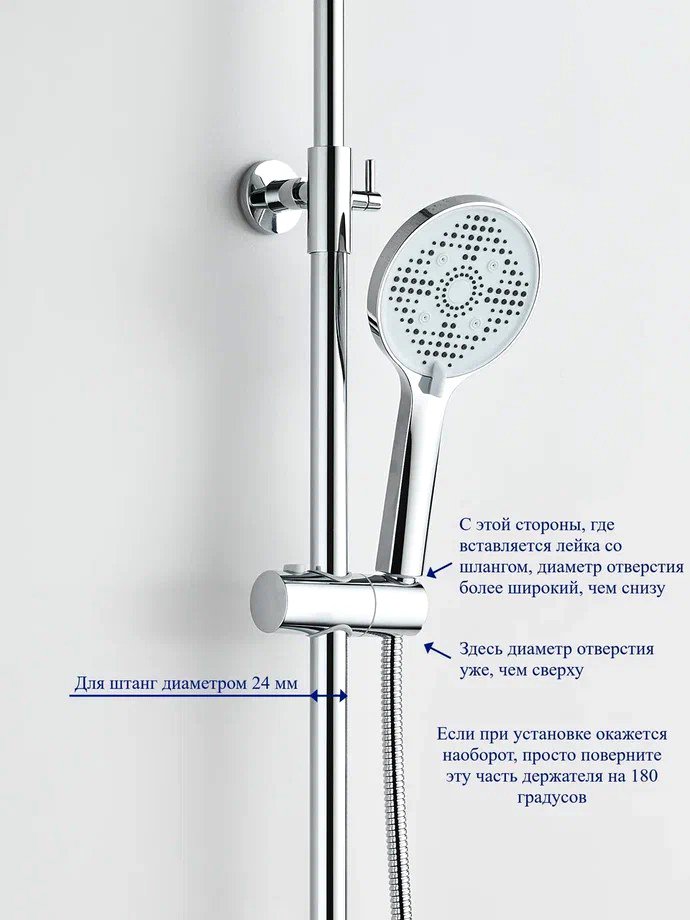 Держатель душевой лейки на штангу BOND BSH2400 предназначен для установки на штангу душевой стойки, душевой системы, душевого гарнитура, душевого комплекта толщиной 24мм. Держатель для штанги можно регулировать по высоте, просто нажав на кнопку фиксатора. Также можно менять угол наклона лейки, обеспечивая комфорт при использовании.