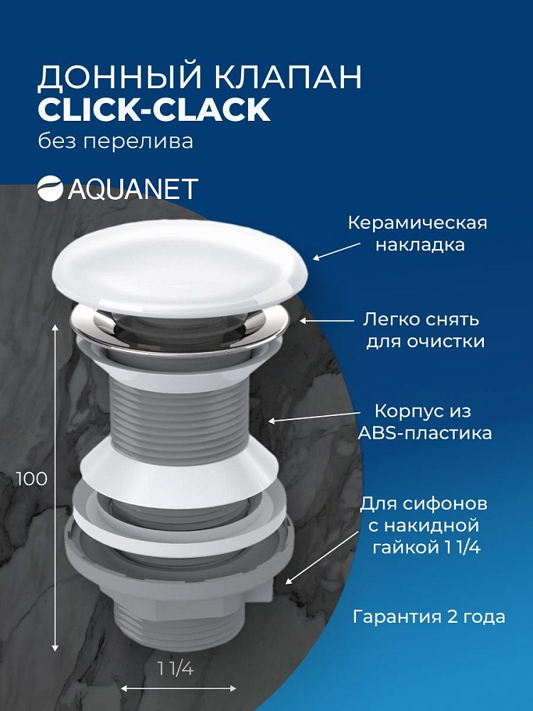 Донный клапан для раковины с переливом Aquanet click/clack (клик-клак) 1 1/4 белый