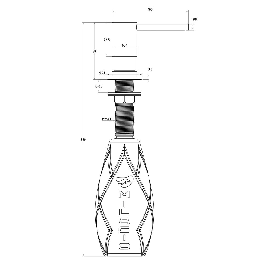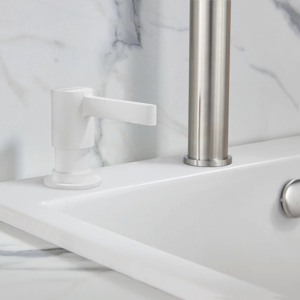 Механический врезной дозатор для мыла и моющего средства Milacio MCU.933 — стильное решение и яркая изюминка в вашем интерьере. Современный минималистичный дизайн подчеркнет достоинства вашей кухни. Данная модель изготовлена из латуни — сплава меди, цинка и олова — качественного материала, устойчивого к любым повреждениям. В отличие от пластиковых диспенсеров латунные изделия выглядят дороже и роскошнее, а на практике показывают себя надежнее. При должном обращении они должны служить не меньше, чем смесители или даже кухонные мойки. Для того, чтобы установить дозатор, не понадобится много времени. Он легко встраивается в мойку или столешницу при помощи монтажной трубки и прижимной гайки. За одно нажатие выдается стандартная доза жидкости, позволяющая помыть руки или несколько тарелок в раковине. Все это обеспечивает разумное потребление и экономичность используемых средств. Так же стоит отметить очень легкий процесс заправки: нужно просто вынуть нажимную головку дозатора и залить моющее средство или жидкое мыло в колбу. Наличие подобного устройства позволяет не держать на виду бытовую химию и средства гигиены, что экономит рабочее пространство и избавляет от визуального шума, делая помещение более привлекательным. Колба дозатора изготовлена из стеклопластика, что сводит к минимуму её механическое повреждение в процессе эксплуатации.