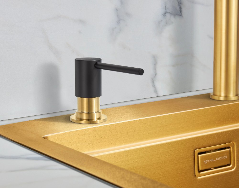 Дозатор для кухонной мойки Milacio MCU.934.BGD в золотисто-чёрном исполнении — это стильный и функциональный аксессуар для вашей кухни. Благодаря возможности врезки в мойку или столешницу при помощи монтажной трубки и прижимной гайки, установка дозатора не займёт много времени и не потребует специальных навыков.За одно нажатие вы получаете стандартную дозу жидкости, которой достаточно для мытья рук или нескольких тарелок в раковине. Это не только удобно, но и экономично — вы всегда будете использовать ровно столько моющего средства, сколько нужно. Заправка дозатора также не вызовет затруднений: достаточно вынуть нажимную головку и залить моющее средство или жидкое мыло в колбу.Колба изготовлена из прочного стеклопластика, что обеспечивает долговечность и надёжность работы устройства. Максимальная толщина столешницы для монтажа составляет 5,3 см, а минимальный и максимальный диаметры отверстия для врезки — 2,5 см и 3,5 см соответственно. В комплект входят диспенсер с креплением, колба и трубка, что делает дозатор Milacio MCU.934.BGD готовым к использованию решением для вашей кухни.Бесшумная работа дозатора создаёт дополнительный комфорт при использовании. С Milacio MCU.934.BGD ваша кухня станет не только более функциональной, но и эстетически привлекательной благодаря стильному дизайну.