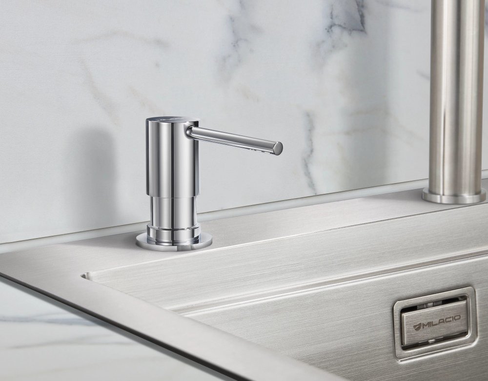 Дозатор для кухонной мойки Milacio MCU.934.CR хром — это стильное и практичное решение для вашей кухни. Встраиваемая конструкция позволяет легко интегрировать дозатор в мойку или столешницу при помощи монтажной трубки и прижимной гайки. Вы сможете подобрать оптимальное расположение устройства, не нарушая эстетику интерьера. За одно нажатие дозатор выдаёт стандартную дозу жидкости, что удобно для мытья рук или нескольких тарелок в раковине. Лёгкий процесс заправки также является преимуществом: достаточно вынуть нажимную головку дозатора и залить моющее средство или жидкое мыло в колбу. Бесшумность работы — ещё один плюс данной модели. Вы не будете отвлекаться на звуки, сопровождающие использование дозатора. Колба изготовлена из стеклопластика, что обеспечивает её долговечность и устойчивость к химическим воздействиям. Максимальная толщина столешницы для монтажа составляет 5,3 см, а минимальный и максимальный диаметры отверстия для врезки — 2,5 см и 3,5 см соответственно. В комплекте с дозатором вы получите всё необходимое для его установки и использования: диспенсер с креплением, колба и трубка. Выбирая дозатор для кухонной мойки Milacio MCU.934.CR хром, вы получаете надёжное и удобное в использовании устройство, которое станет незаменимым помощником на вашей кухне.