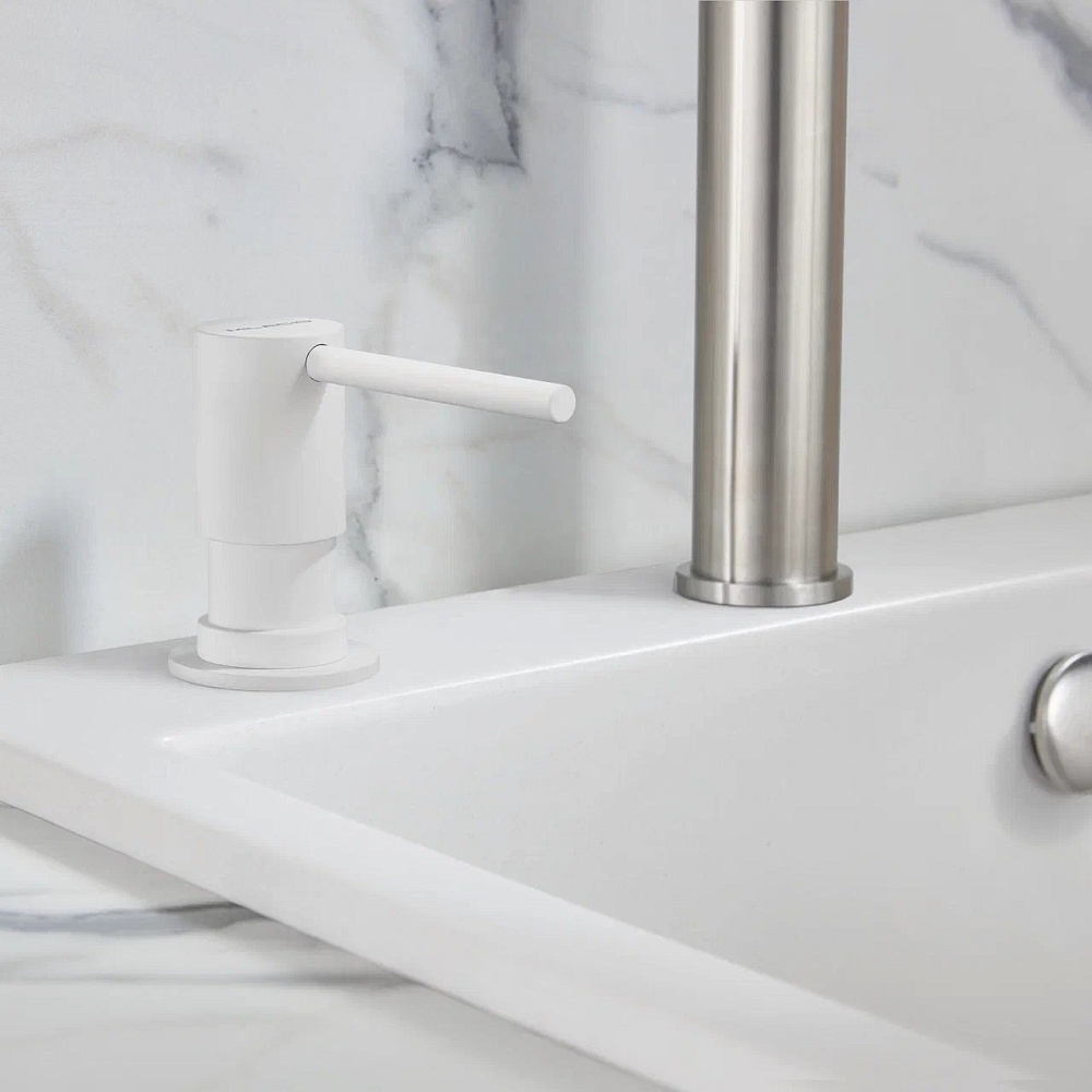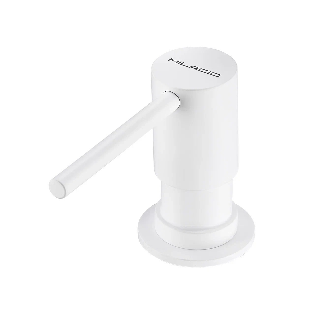 Механический врезной дозатор для мыла и моющего средства Milacio MCU.934 — стильное решение и яркая изюминка в вашем интерьере. Современный минималистичный дизайн подчеркнет достоинства вашей кухни. Данная модель изготовлена из латуни — сплава меди, цинка и олова — качественного материала, устойчивого к любым повреждениям. В отличие от пластиковых диспенсеров латунные изделия выглядят дороже и роскошнее, а на практике показывают себя надежнее. При должном обращении они должны служить не меньше, чем смесители или даже кухонные мойки. Для того, чтобы установить дозатор, не понадобится много времени. Он легко встраивается в мойку или столешницу при помощи монтажной трубки и прижимной гайки. За одно нажатие выдается стандартная доза жидкости, позволяющая помыть руки или несколько тарелок в раковине. Все это обеспечивает разумное потребление и экономичность используемых средств. Так же стоит отметить очень легкий процесс заправки: нужно просто вынуть нажимную головку дозатора и залить моющее средство или жидкое мыло в колбу. Наличие подобного устройства позволяет не держать на виду бытовую химию и средства гигиены, что экономит рабочее пространство и избавляет от визуального шума, делая помещение более привлекательным. Колба дозатора изготовлена из стеклопластика, что сводит к минимуму её механическое повреждение в процессе эксплуатации.