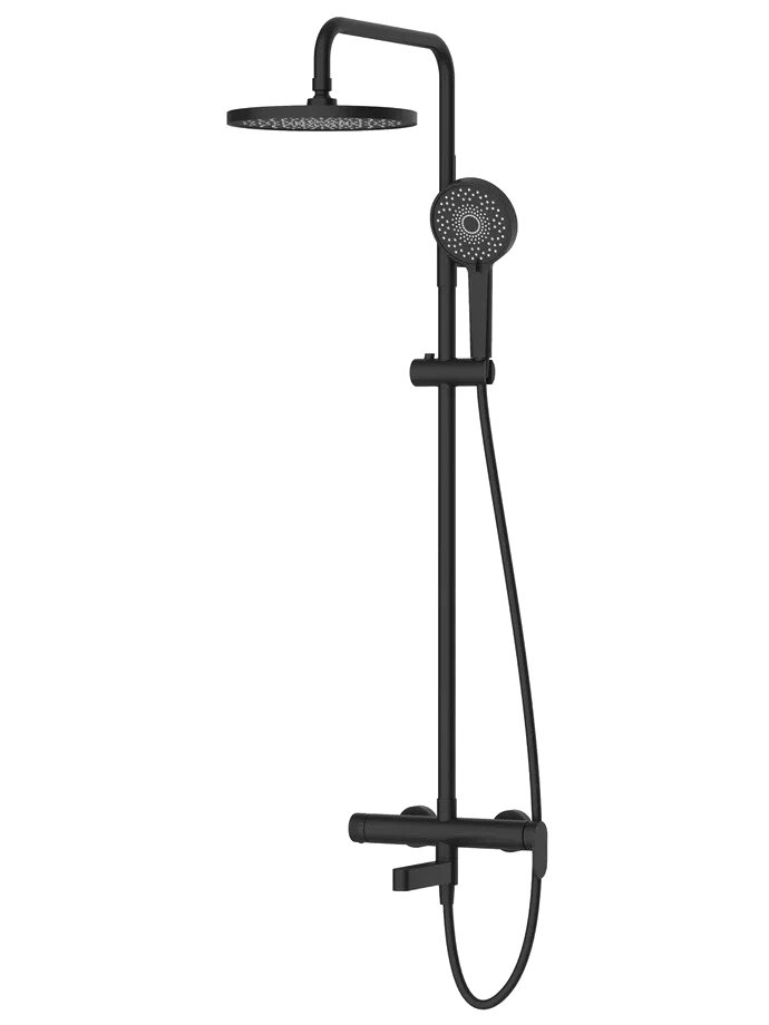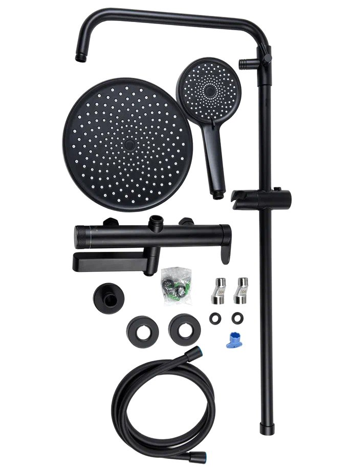 Душевая система AGGER Sweet гармонично дополнит интерьер ванной комнаты в современном стиле. Управление осуществляется с помощью эргономичного рычага и поворотного дивертора, создавая идеальные условия для принятия водных процедур. Однозахватный смеситель для ванны/душа с поворотным изливом изготовлен из высококачественной нержавеющей стали, не подверженной окислению от постоянного контакта с водой. Покрытие в цвете матовый черный, за которым просто ухаживать мягкой салфеткой, нанесено методом порошковой окраски с многоступенчатой системой подготовки и высокотемпературной обработкой. Встроенный аэратор экономит воду и, обогащая её воздухом, делает струю мягкой и без брызг. Регулируемый по высоте и наклону верхний душ (d253 мм) и ручная лейка (d125 мм, 3 режима струи) доставят истинное удовольствие при принятии водных процедур (ручная лейка и верхний душ с защитой от известкового налета). Штанга (860-1210 мм) телескопическая, держатель ручного душа с регулировкой угла наклона, шланг 1500 мм PVC с защитой от перекручивания.