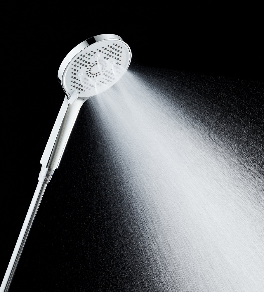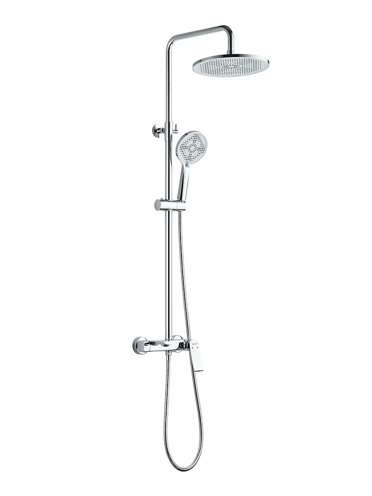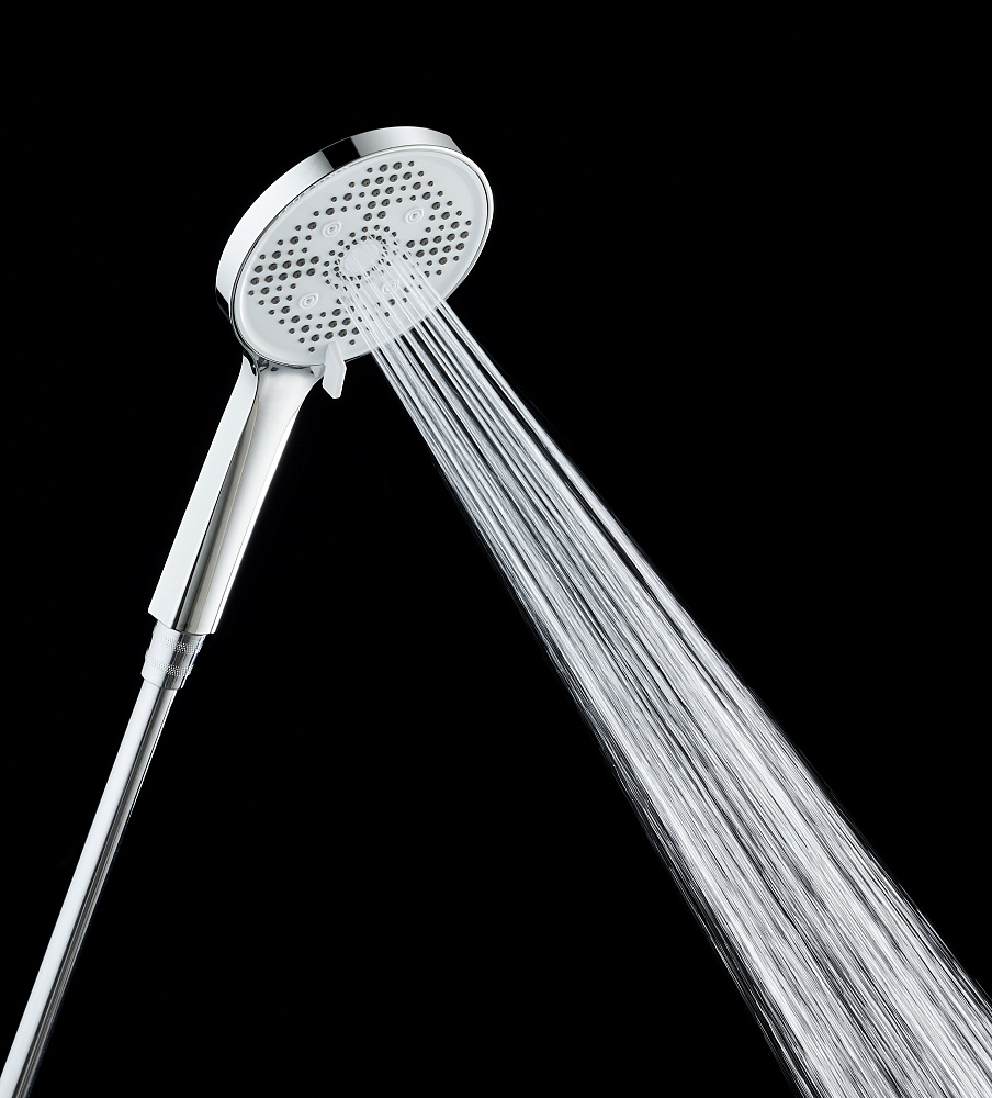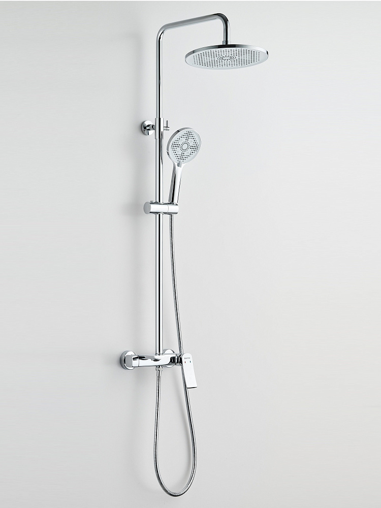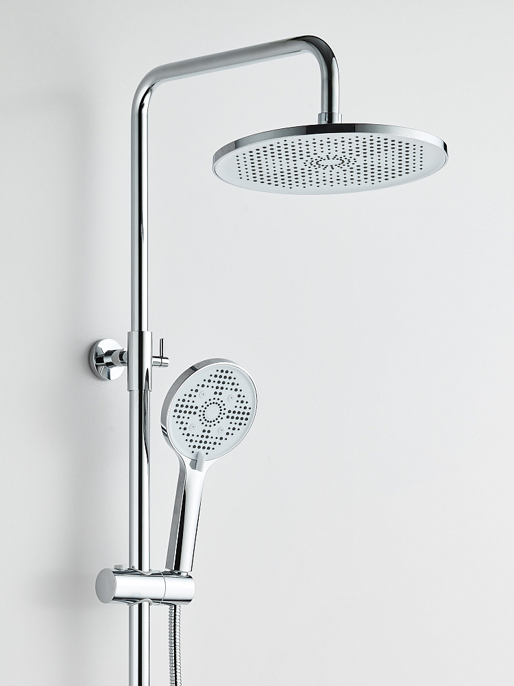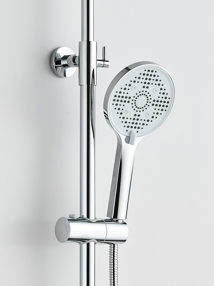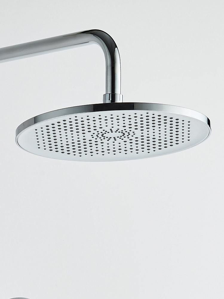 Регулируемый по углу наклона верхний душ с силиконовыми форсунками, благодаря которым можно очистить их от известкового налета просто потерев ладонью. Плоская поверхность смесителя делает его еще более эргономичным, позволяя использовать ее как полочку для душевых принадлежностей.