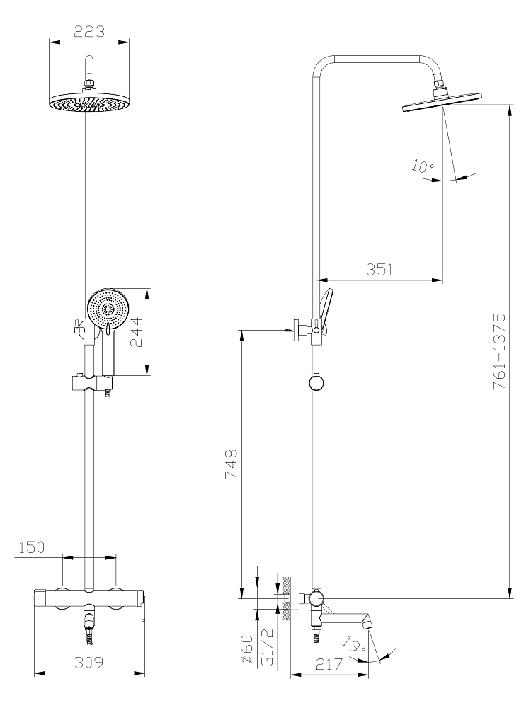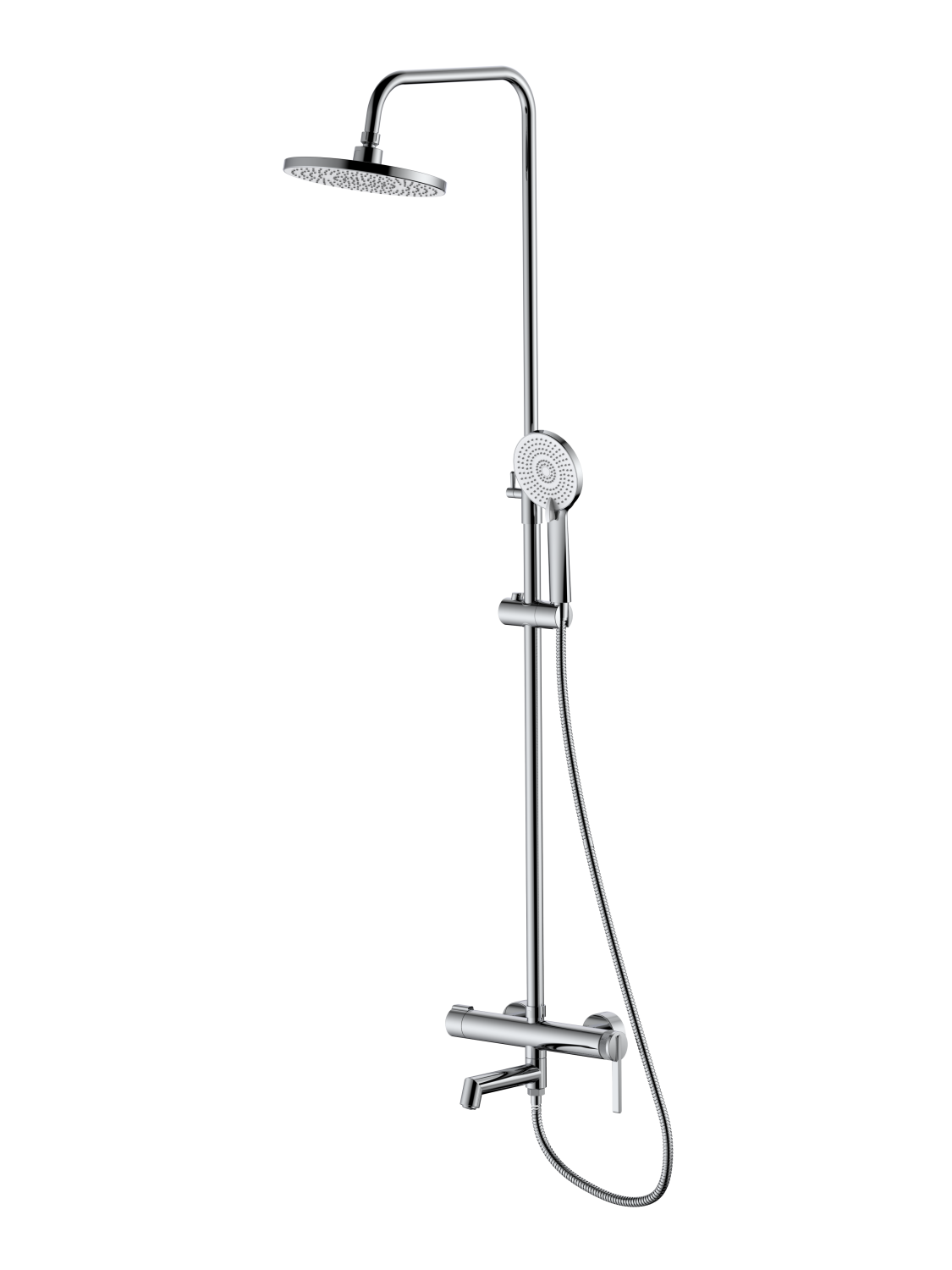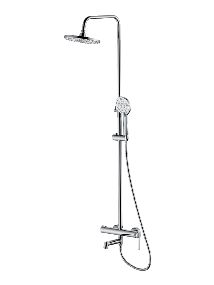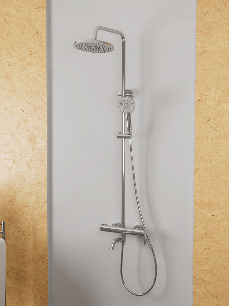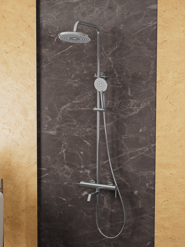 В комплекте 3-x режимная душевая лейка, 1-режимный тропический душ, изготовленный из современной прочной пластмассы, душевая штанга, держатель душевой лейки, душевой шланг с латунными гайками 150см, смеситель, паспорт изделия.