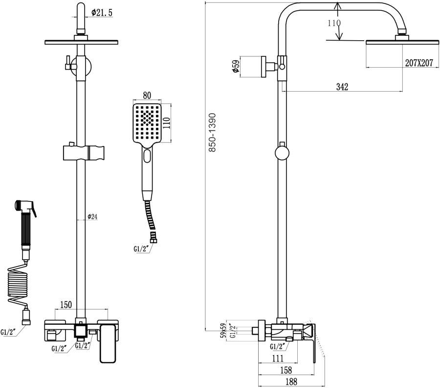 держатель для душа / душевая лейка / душевой шланг / переключатель потоков / гигиенический душ