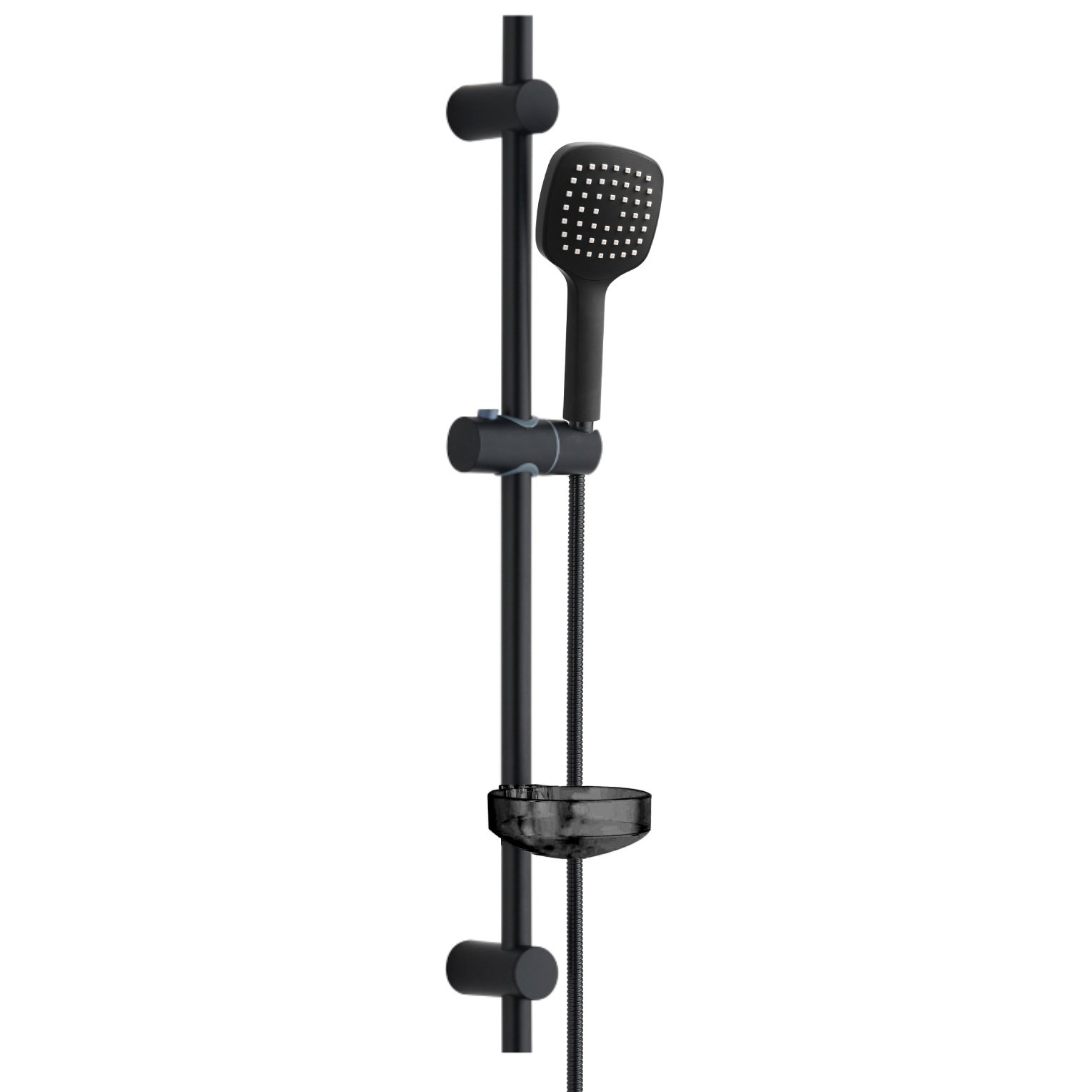 Душевой гарнитур Orange в цвете матовый черный украсит интерьер ванной комнаты в современном стиле. Подвижные детали отличаются долговечностью. Гарнитур включает в себя: ручной душ (110 мм) - 1 режим струи, форсунки с функцией легкого очищения от известкового налета, система AIR IN обеспечивает увеличенный напор и вместе с тем сокращает расход воды, материал ABS-пластик; душевой шланг 1500-1800 мм в металлической оплетке, с защитой от перекручивания; держатель ручного душа на штанге с регулировкой угла наклона и по высоте; штанга 700 мм с подвижными держателями (возможность установки в старые отверстия), материал штанги нержавеющая сталь; быстросъемная мыльница - материал ABS-пластик.