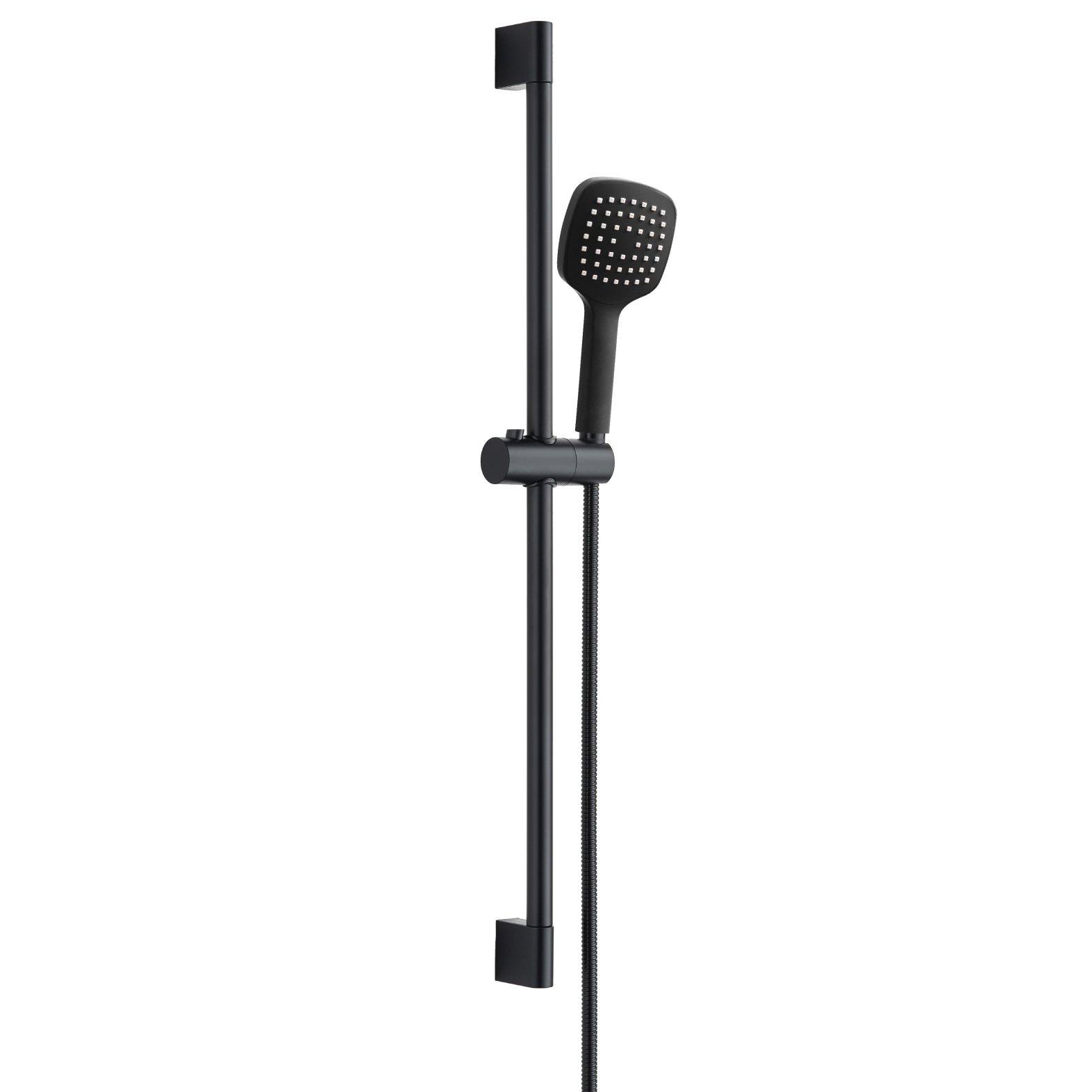 Душевой гарнитур Orange в цвете матовый черный украсит интерьер ванной комнаты в современном стиле. Подвижные детали отличаются долговечностью. Гарнитур включает в себя: ручной душ (110 мм) - 1 режим струи, форсунки с функцией легкого очищения от известкового налета, система AIR IN обеспечивает увеличенный напор и вместе с тем сокращает расход воды, материал ABS-пластик; душевой шланг 1500-1800 мм в металлической оплетке, с защитой от перекручивания; держатель ручного душа на штанге с регулировкой угла наклона и по высоте; штанга 700 мм с фиксированными держателями, материал штанги нержавеющая сталь.