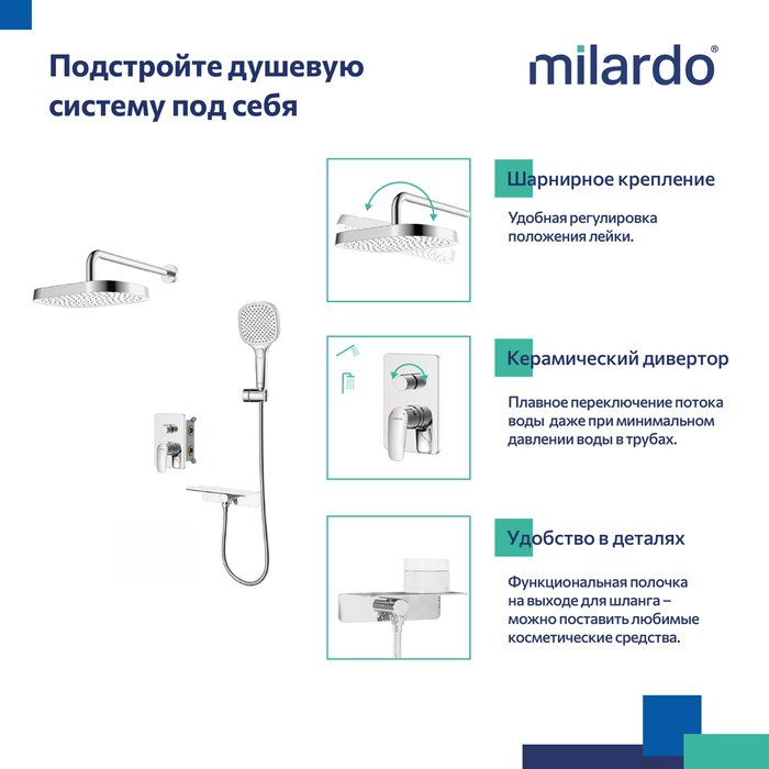 Душевая система – это продуманный выбор для комфортного дома с душевой зоной на два выхода: с ручным изливом и тропическим душем. Готовое решение – это экономия времени на поиски отдельных деталей, гармонично сочетающихся между собой, а также простая возможность самостоятельно реализовать понравившиеся дизайнерские решения.