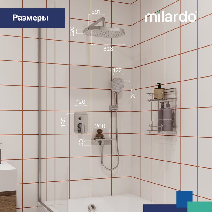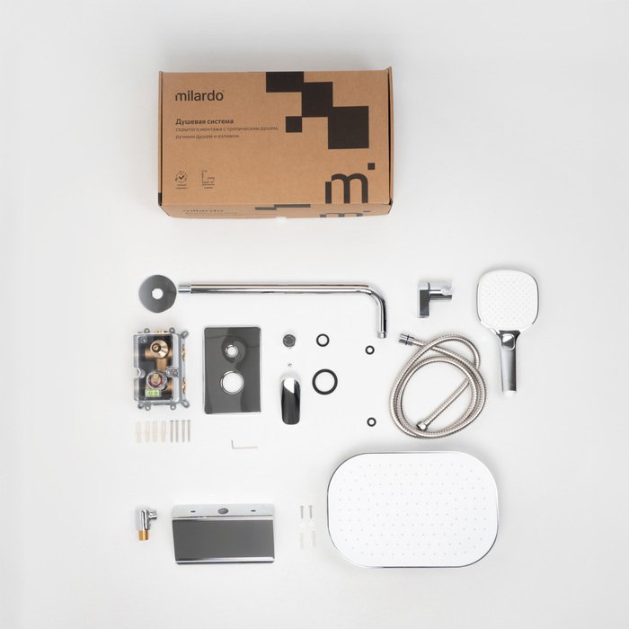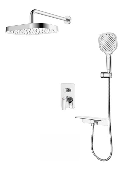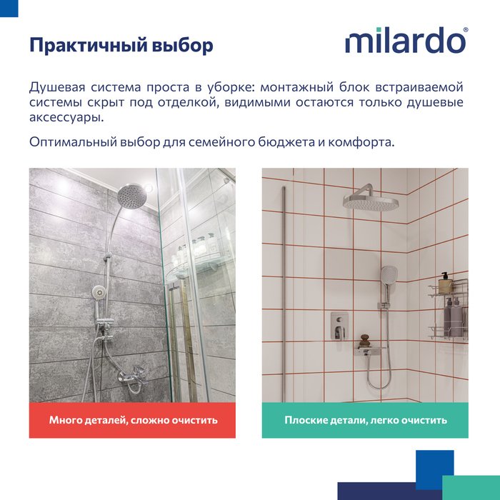 Встраиваемый монтажный блок со всеми механизмами скрыт под отделкой, видимыми остаются только элементы управления и душевые аксессуары трендовой квадратной формы. Такой продукт можно смело выбирать просто за красивые линии.
