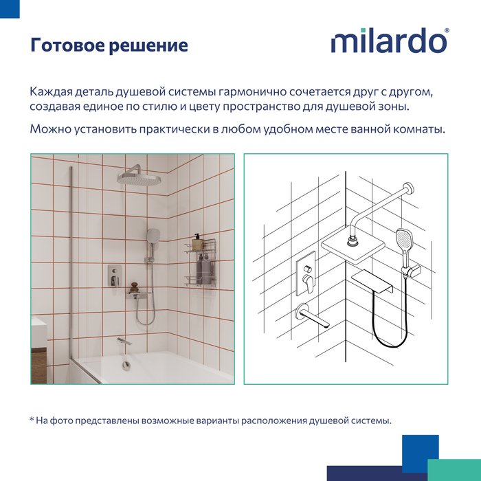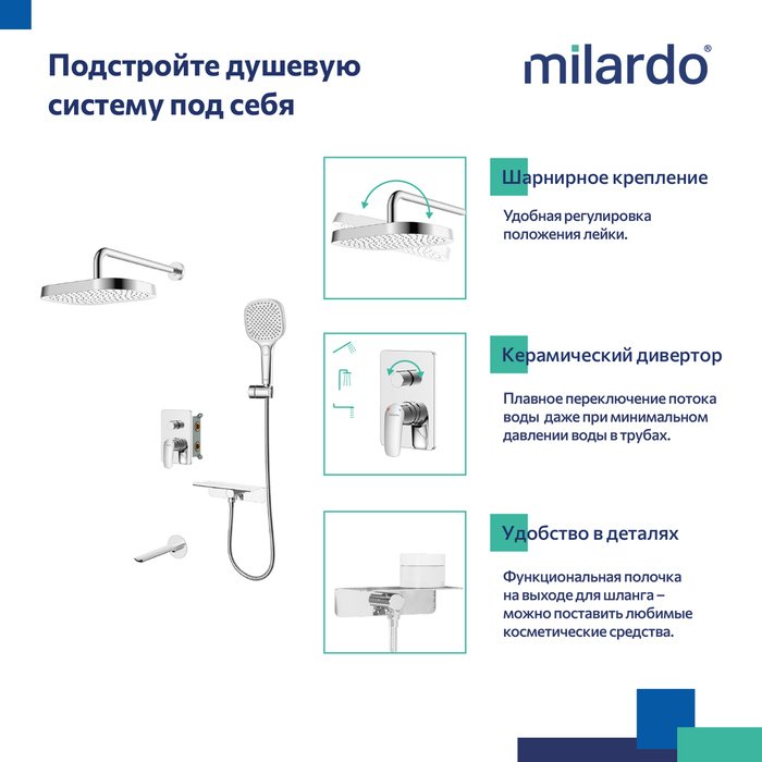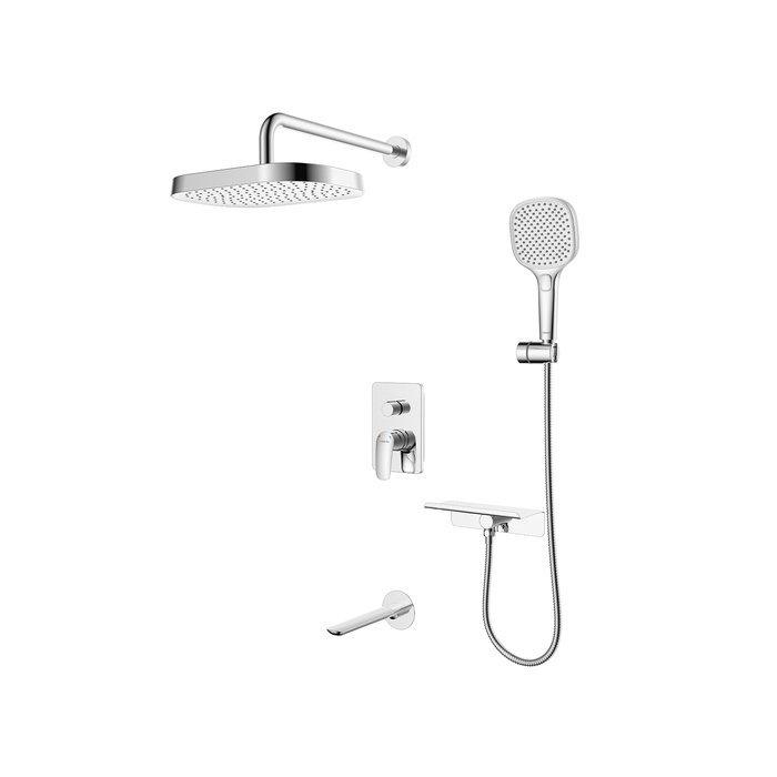 Душевая система – это продуманный выбор для комфортного дома с душевой зоной на три выхода: с ручным душем, изливом, и тропическим душем. Модель подходит для установки как в зоне ванной, так и душевой. Готовое решение – это экономия времени на поиски отдельных деталей, гармонично сочетающихся между собой, а также простая возможность самостоятельно реализовать понравившиеся дизайнерские решения.