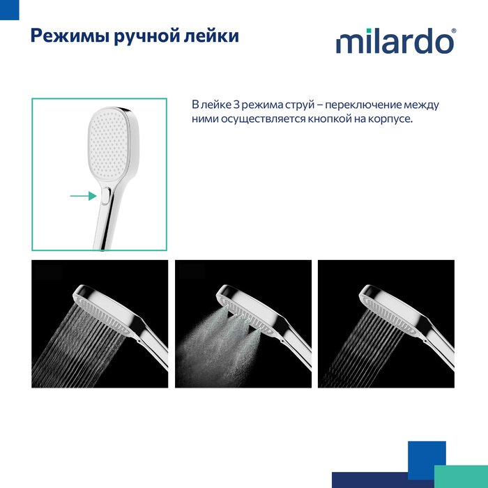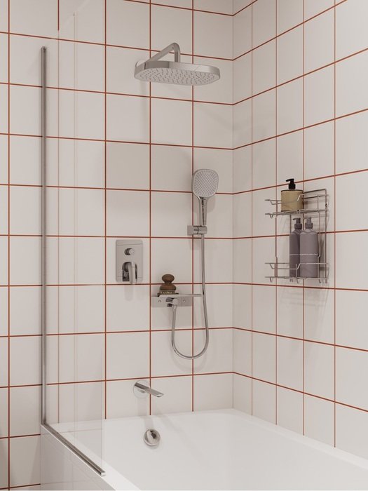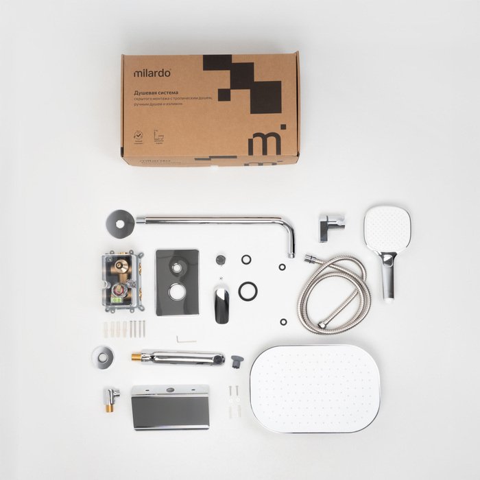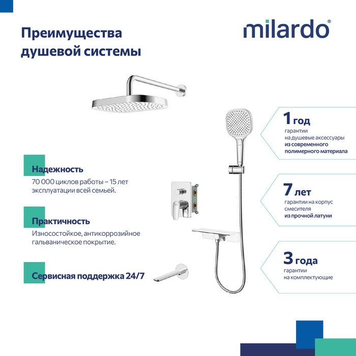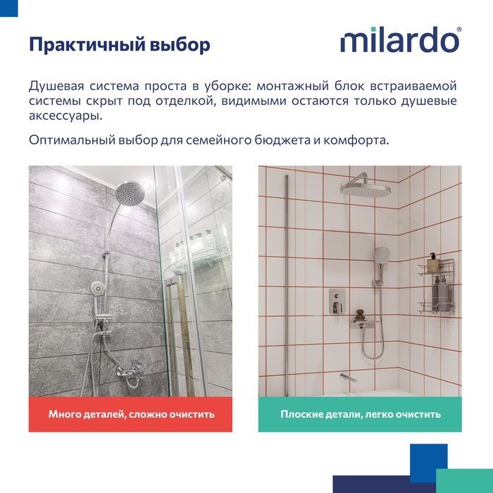 Встраиваемый монтажный блок со всеми механизмами скрыт под отделкой, видимыми остаются только элементы управления и душевые аксессуары трендовой квадратной формы. Такой продукт можно смело выбирать просто за красивые линии.