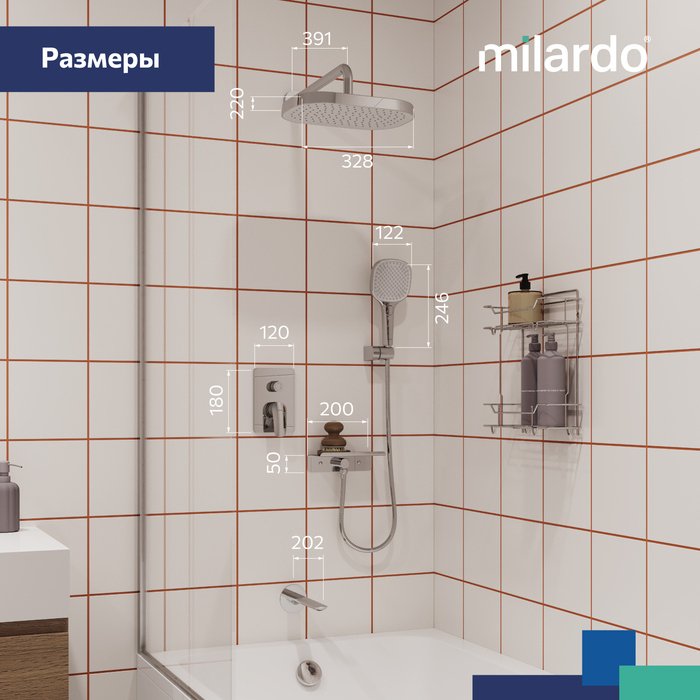 В комплекте есть все необходимое для использования сразу после установки: душевой шланг (1,5 м) в оплетке из нержавеющей стали; тропический душ и трехрежимная ручная лейка с режимом работы «водный туман» для максимального расслабления. Выход для шланга интегрирован с небольшой полочкой – на ней можно разместить любимые косметические средства.