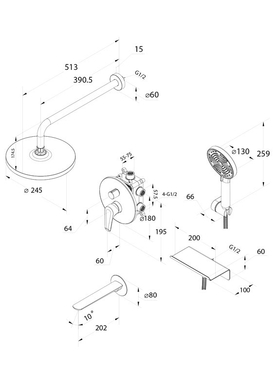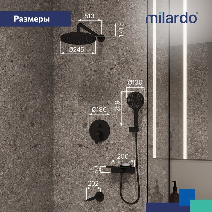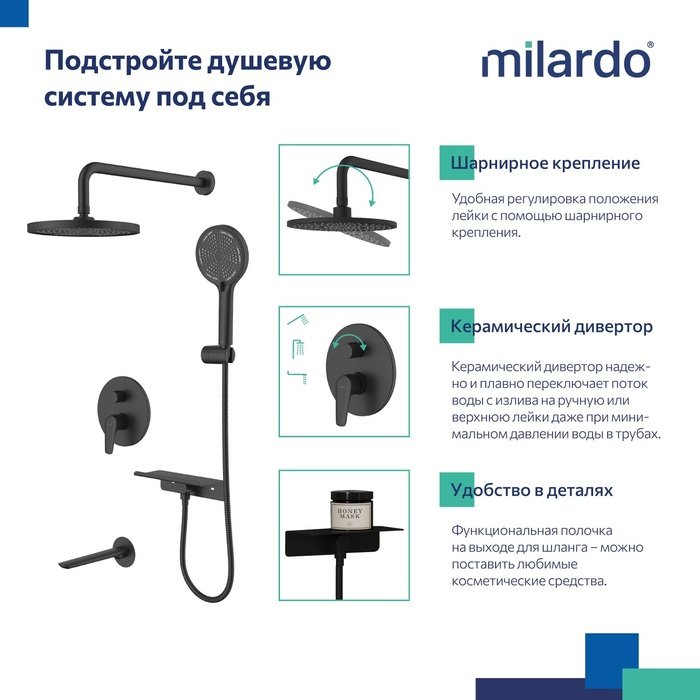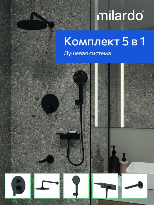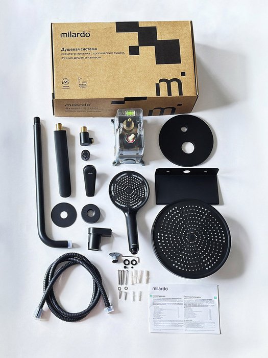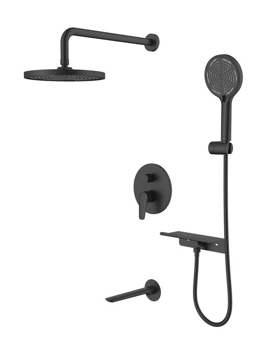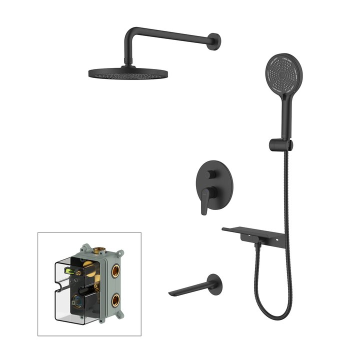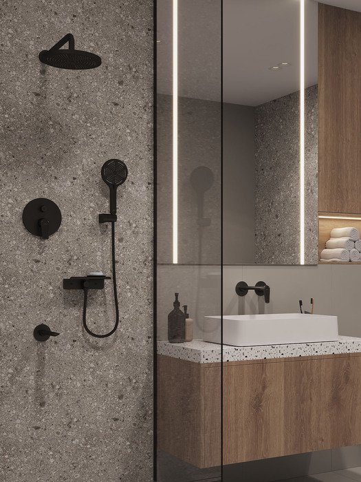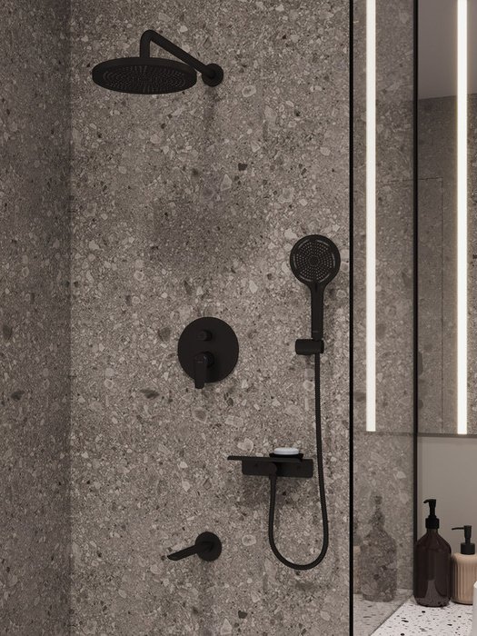 Душевой комплект в черном цвете поможет создать пространство ванной комнаты, где нет ничего лишнего. Система скрытого монтажа на три выхода – универсальное решение: она подойдет для установки как в зоне с ванной, так и душевой зоне. Размещайте элементы душевой системы по своему усмотрению, реализуя самые стильные проекты. Все внутренние механизмы системы будут спрятаны внутри встраиваемого монтажного бокса, видимыми останутся только элементы управления.