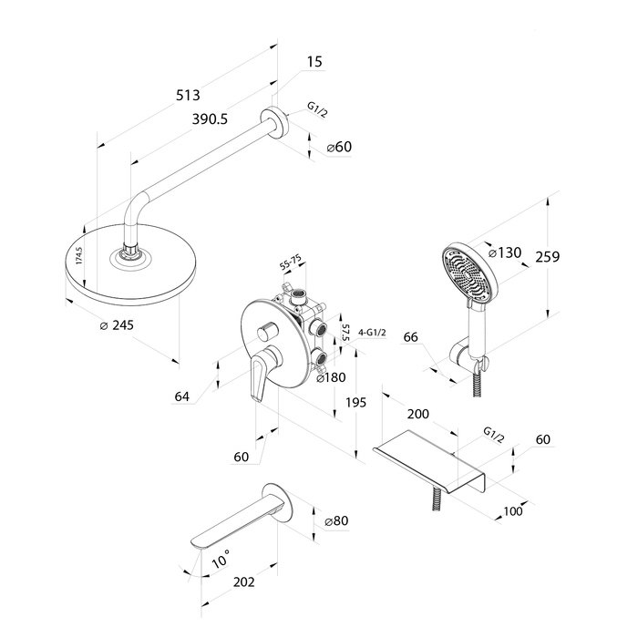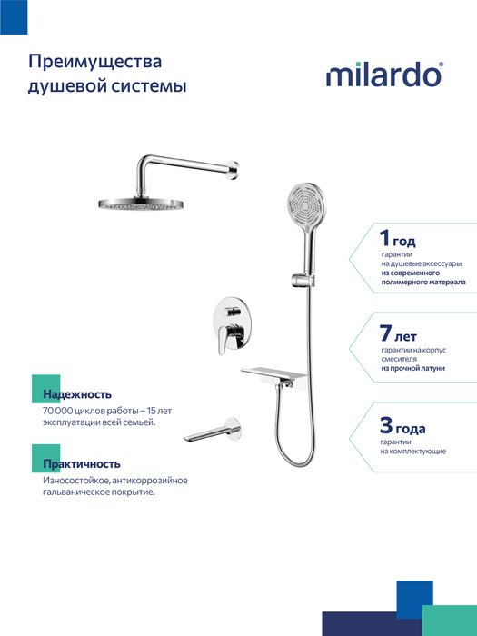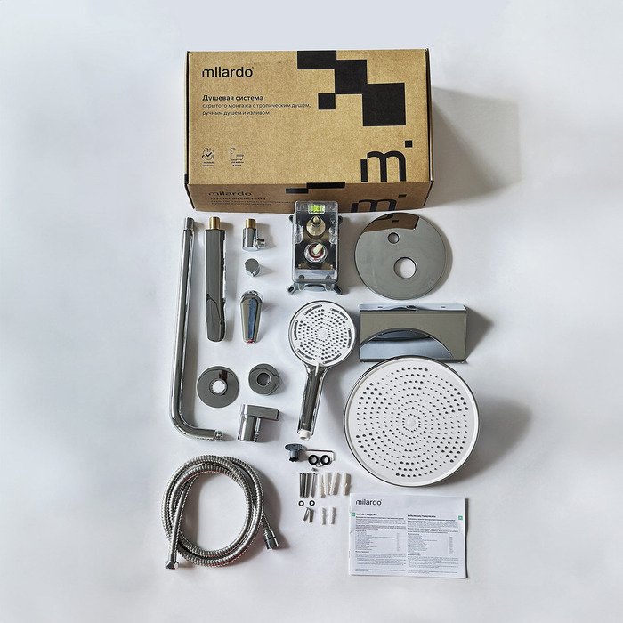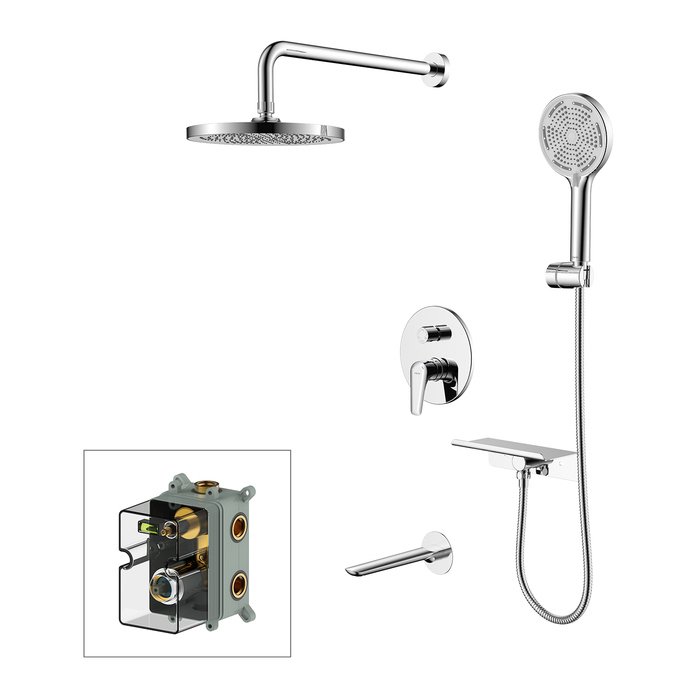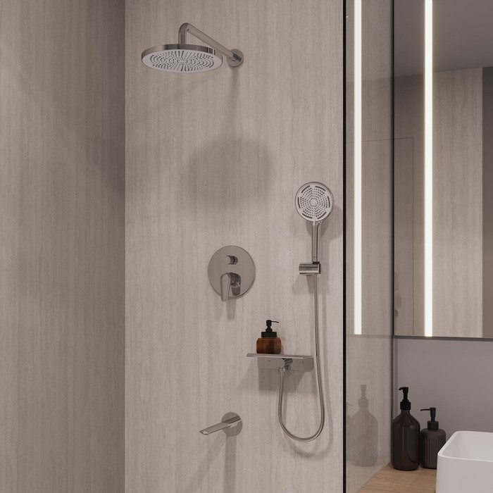 Душевой комплект поможет создать пространство ванной комнаты, где нет ничего лишнего. Система скрытого монтажа на три выхода – универсальное решение: она подойдет для установки как в зоне с ванной, так и душевой зоне. Размещайте элементы душевой системы по своему усмотрению, реализуя самые стильные проекты. Все внутренние механизмы системы будут спрятаны внутри встраиваемого монтажного бокса, видимыми останутся только элементы управления.