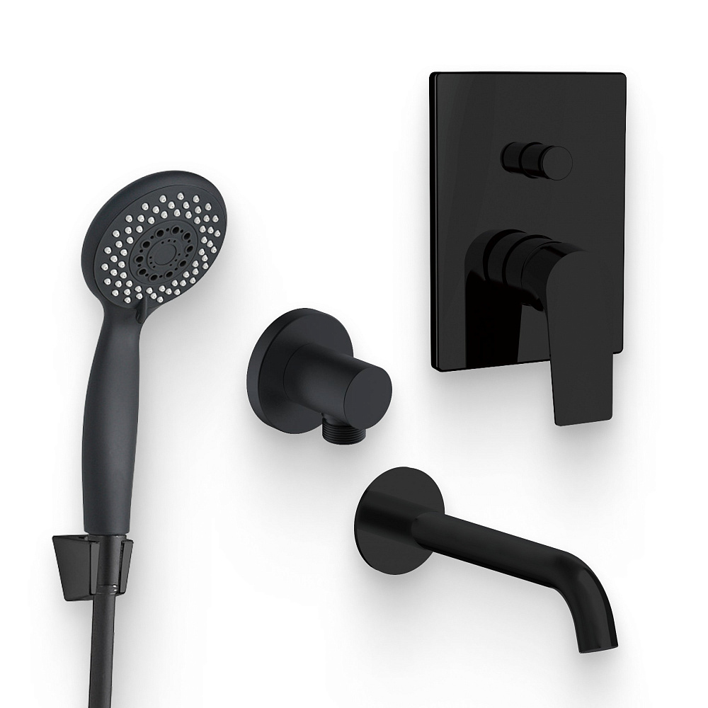 Душевой комплект Смеситель Aquanet Static AF330-51B С ВНУТРЕННЕЙ ЧАСТЬЮ, чёрный + Душевая лейка AF000-07B чёрная матовая + Подключение AF330-92B чёрное матовое + Излив AF330-98B для ванны, чёрный матовый