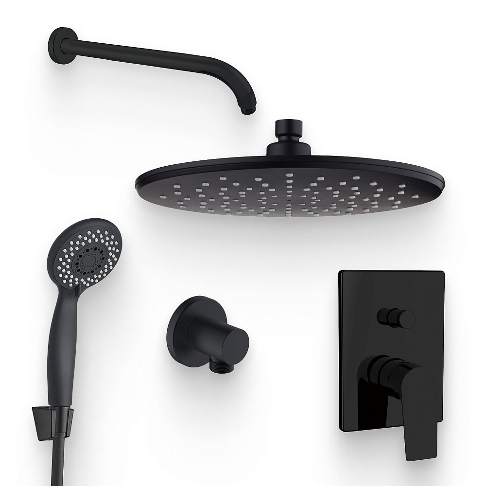 Душевой комплект Смеситель Aquanet Static AF330-51B С ВНУТРЕННЕЙ ЧАСТЬЮ, чёрный + Душевая лейка AF000-07B чёрная матовая + Подключение AF330-92B чёрное матовое + Душ AF330-84-R250B черный матовый + Кронштейн AF330-91B чёрный матовый