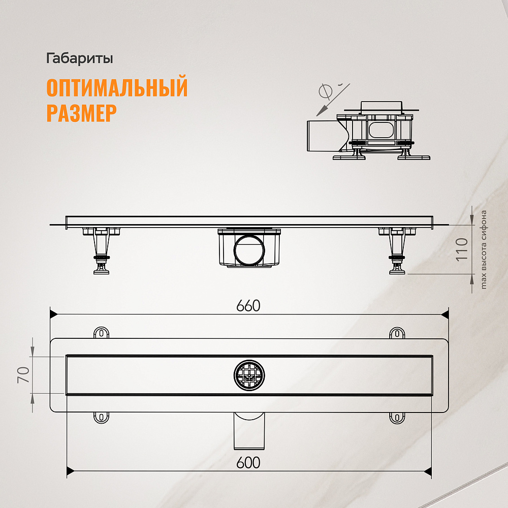 Черный душевой лоток CK DRAIN AQPP01-G-60 идеально подходит для оборудования современной душевой зоны. Дизайн лаконичен, что позволяет вписать модель в минималистичные и хай-тек-интерьеры. Лоток с желобом и щелевой двухсторонней решеткой изготовлен из листовой нержавеющей стали AISI 304 с минимумом сварки. Он обладает высокой пропускной способностью (55 л/мин) и поддерживает пристенный монтаж вровень с полом. Это обеспечивает быстрый отвод воды и удобное размещение во время приема душа. В комплекте регулируемые опоры и сифон с сухим затвором, который отсечет нежелательные запахи из канализации.
