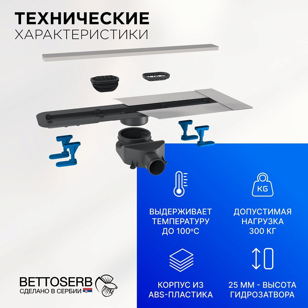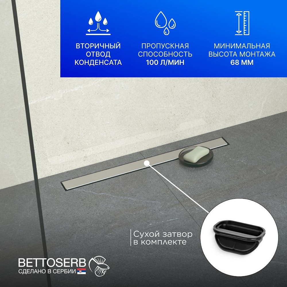 Душевой трап (лоток) BETTOSERB Frameless Line 850 Drain — это стильное и функциональное решение для вашей ванной комнаты. Модель представлена в двух дизайнах: с одной стороны — матовый хром, с другой — полая поверхность, идеально подходящая для укладки плитки. Одной из ключевых особенностей этого душевого трапа является S-образный сифон, разработанный с высокой степенью функциональности. Он эффективно предотвращает проникновение неприятных запахов из канализации, обеспечивая комфорт и свежесть в вашей ванной комнате. Ещё одним преимуществом данной модели является возможность регулировки высоты и наклона трапа. Опоры, входящие в комплект, позволяют легко настроить душевой трап под ваши индивидуальные потребности, обеспечивая оптимальный отвод воды и предотвращая возможные засоры. Душевой трап BETTOSERB Frameless Line 850 Drain рассчитан на керамическую плитку толщиной до 12 мм, что делает его универсальным решением для различных дизайнерских проектов. Кроме того, модель оснащена системой слива конденсата в канализацию или сток, что способствует поддержанию чистоты и порядка в ванной комнате. Выбирая душевой трап (лоток) BETTOSERB Frameless Line 850 Drain, вы получаете не только функциональное, но и эстетически привлекательное решение для вашей ванной. Этот трап станет изысканным дополнением к любому интерьеру, придавая ему современный и стильный вид.
