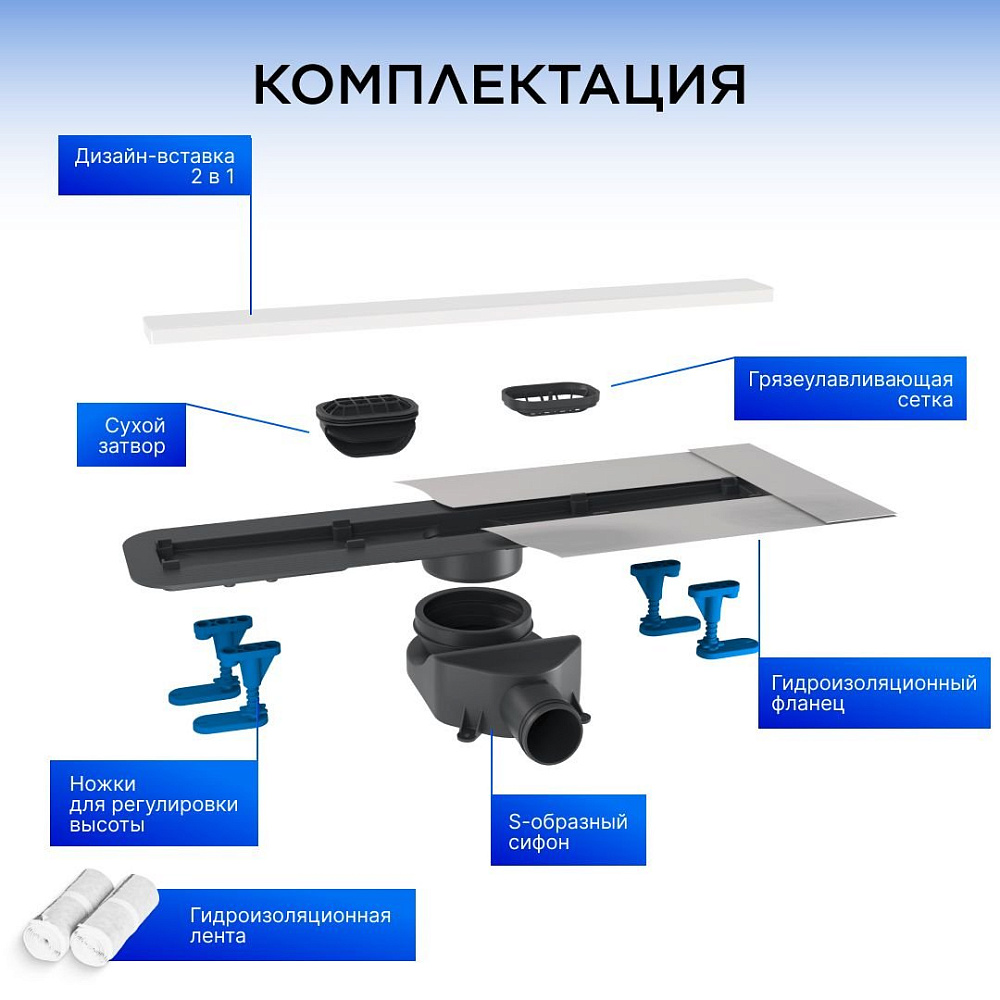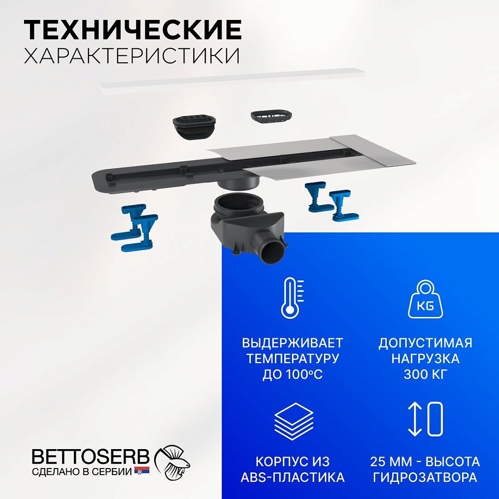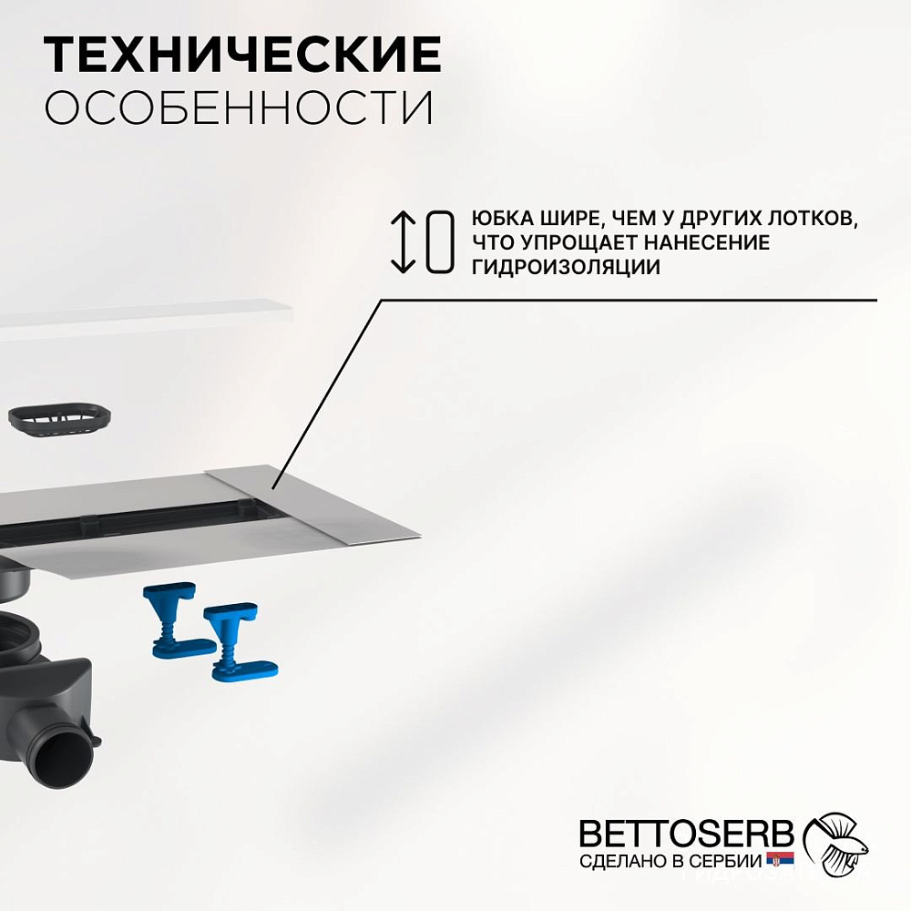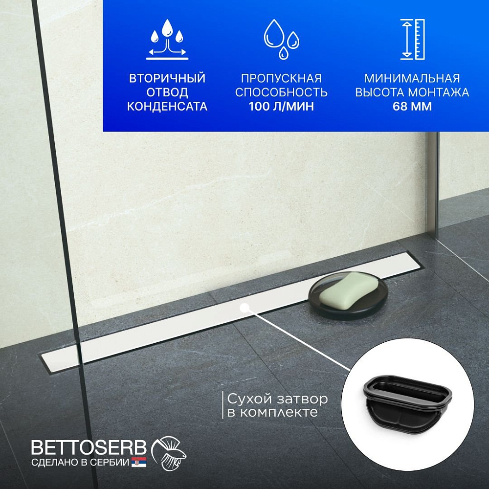 Душевой трап (лоток) BETTOSERB Frameless Line 950 белый матовый — это стильное и практичное решение для вашей ванной комнаты. Модель отличается оригинальным дизайном: двусторонняя дизайн-вставка позволяет использовать трап в двух стилях одновременно. С одной стороны — элегантный матовый белый цвет, который гармонично впишется в любой интерьер, а с другой — предусмотрено место под плитку, что даёт возможность идеально вписать лоток в облицовку.Особенностью модели является S-образный самоочищающийся сифон с покрытием Self-Cleaning. Это решение не только эффективно отводит воду, но и предотвращает засорение благодаря специальным свойствам покрытия. Вы можете быть уверены, что ваш трап будет работать безупречно и не потребует частой чистки.BETTOSERB Frameless Line 950 также отличается функциональностью. В комплект входят опоры, позволяющие регулировать высоту и наклон трапа. Это обеспечивает удобство монтажа и адаптацию под различные дизайнерские решения.Благодаря комбинированному затвору ваша ванна будет надёжно защищена от неприятных запахов из канализации. Это добавляет не только эстетическую привлекательность, но и практическую ценность, обеспечивая комфортное использование ванной комнаты. Душевой трап BETTOSERB Frameless Line 950 — это сочетание стиля, надёжности и функциональности, которое станет отличным дополнением к вашей ванной комнате.