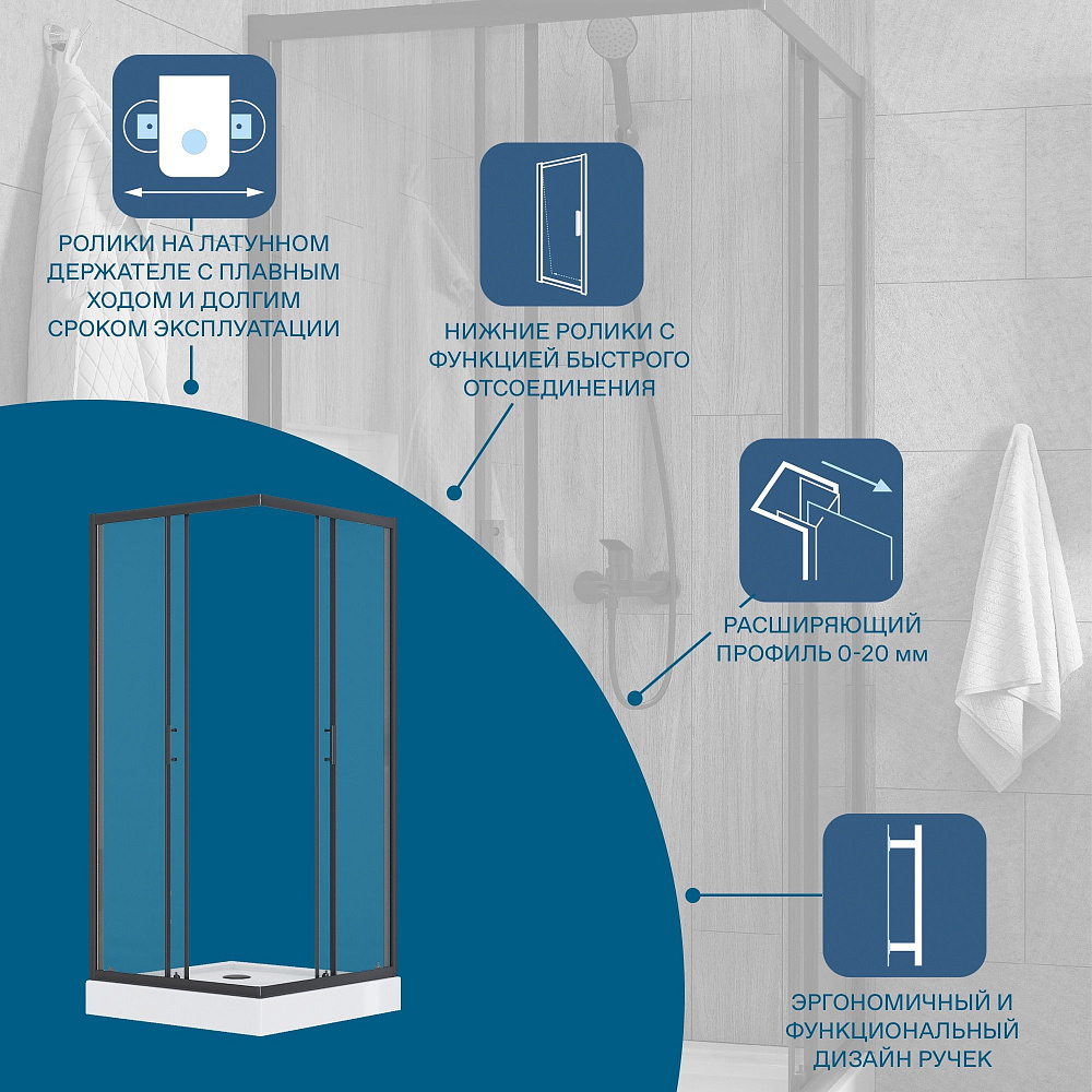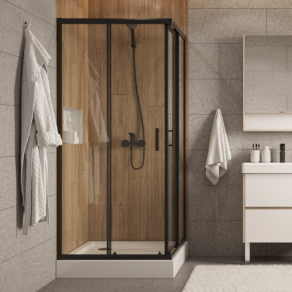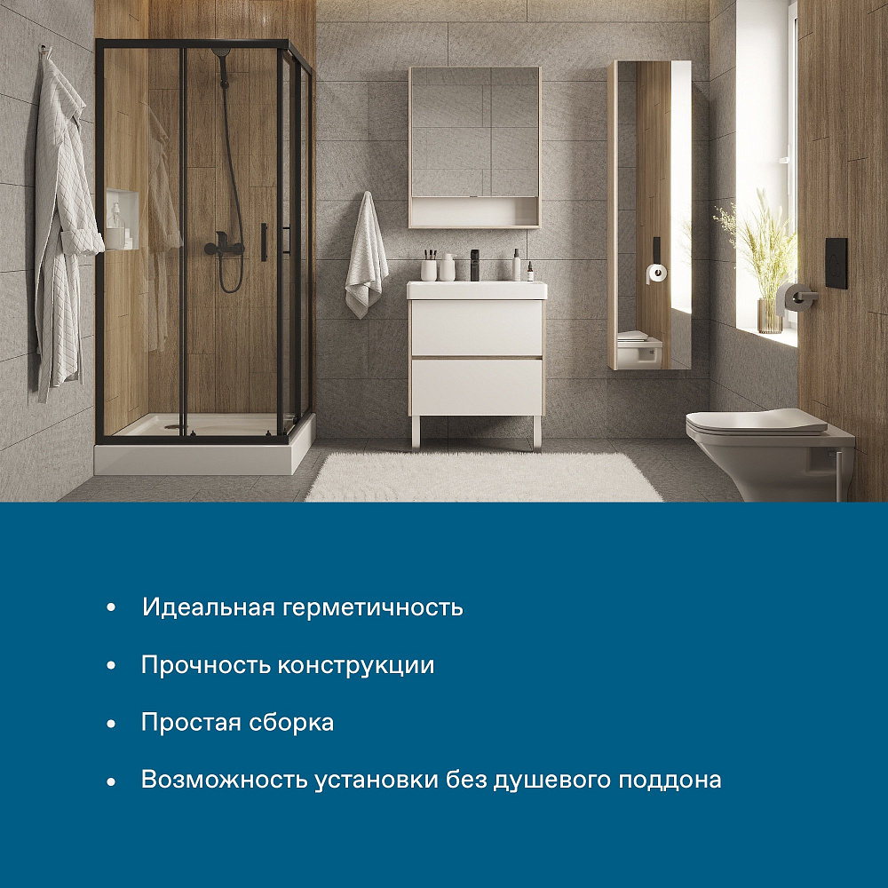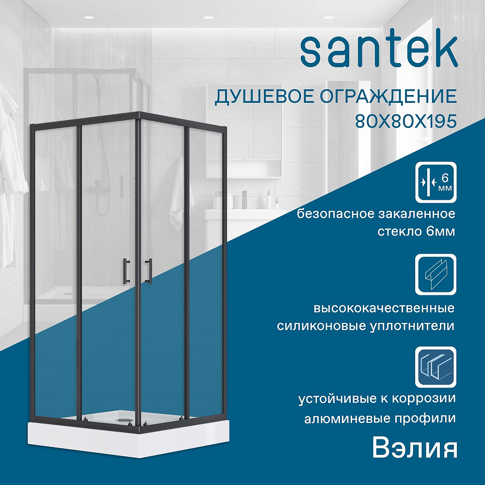 Душевое ограждение Santek Вэлия квадрат 80x80х195 в черном матовом исполнении с прозрачным стеклом - это высококачественное решение для вашего душевого пространства по доступной цене! Безопасное закаленное стекло толщиной 6 мм придает дополнительную монтажную устойчивость конструкции. Алюминиевые профили не подвергаются коррозии благодаря образованию тончайшей оксидной пленки на поверхности, предохраняющей профили ограждения от дальнейших окислительных реакций с водой и воздухом. Качественные ролики на латунных держателях способны выдерживать тяжелые двери на протяжении всего периода службы изделия и также обладают высокой сопротивляемостью коррозии. Долговечные силиконовые уплотнители сохраняют эксплуатационные характеристики многие годы, не стираются и не высыхают – не становятся хрупкими. Дополнительно расширить пространство и нивелировать неровности стен позволяет компенсирующий профиль, создающий пространство для расширения до 20 мм. Быстросъемные нижние ролики делают уход за душевым ограждением более быстрым и простым, позволяя промывать нижнюю часть ограждения за счет дополнительного пространства, возникающего при отсоединении.