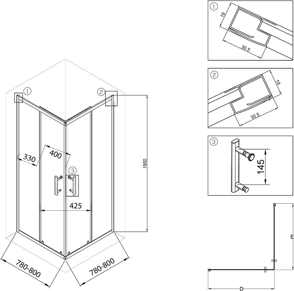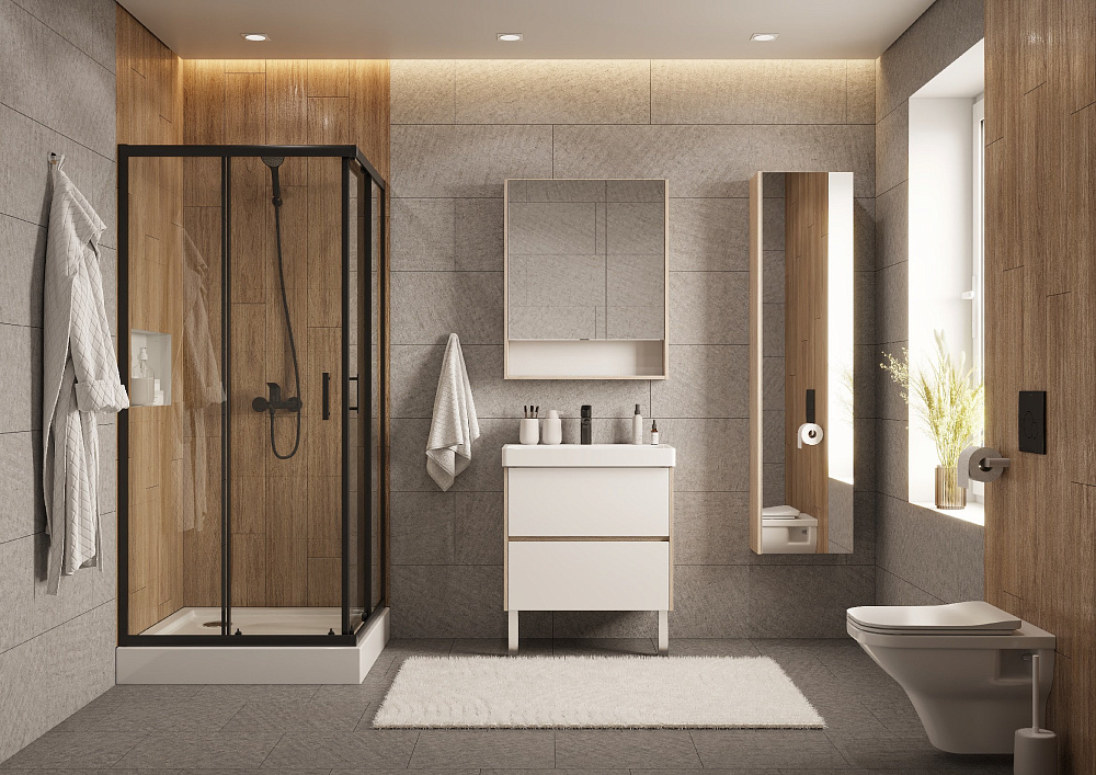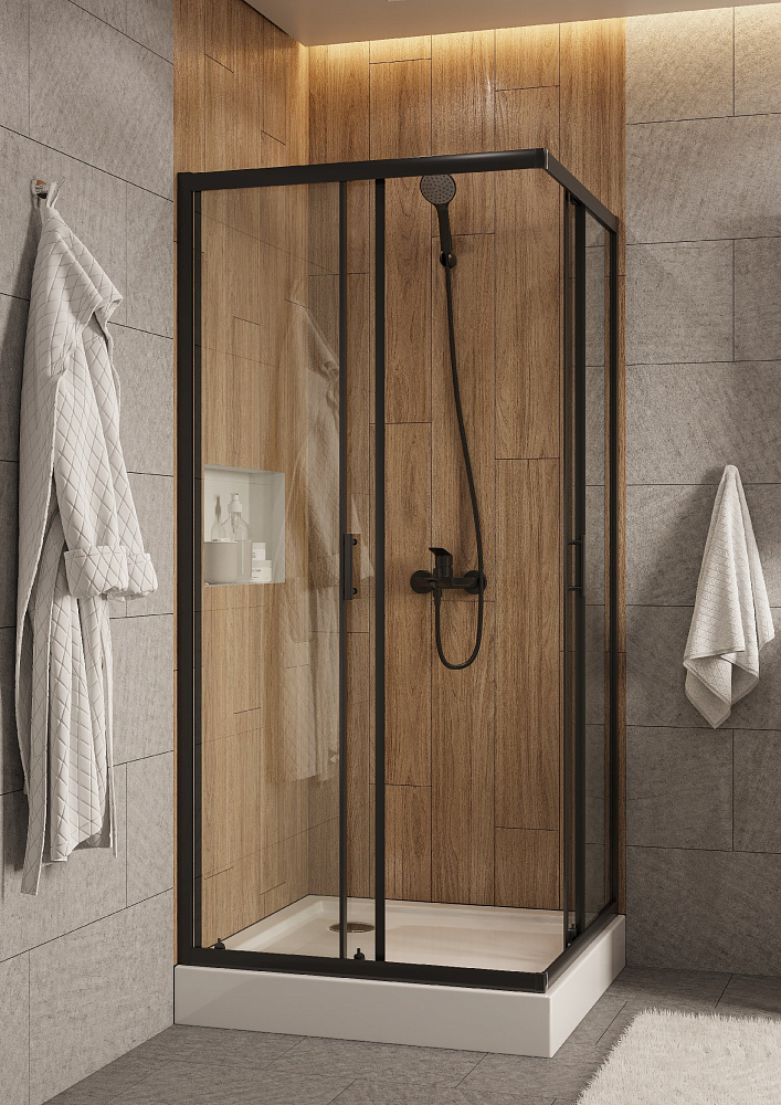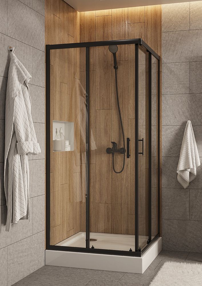 Душевое ограждение Santek Вэлия квадрат 80x80х195 в черном матовом исполнении с прозрачным стеклом - это высококачественное решение для вашего душевого пространства по доступной цене! Безопасное закаленное стекло толщиной 6 мм придает дополнительную монтажную устойчивость конструкции. Алюминиевые профили не подвергаются коррозии благодаря образованию тончайшей оксидной пленки на поверхности, предохраняющей профили ограждения от дальнейших окислительных реакций с водой и воздухом. Качественные ролики на латунных держателях способны выдерживать тяжелые двери на протяжении всего периода службы изделия и также обладают высокой сопротивляемостью коррозии. Долговечные силиконовые уплотнители сохраняют эксплуатационные характеристики многие годы, не стираются и не высыхают – не становятся хрупкими. Дополнительно расширить пространство и нивелировать неровности стен позволяет компенсирующий профиль, создающий пространство для расширения до 20 мм. Быстросъемные нижние ролики делают уход за душевым ограждением более быстрым и простым, позволяя промывать нижнюю часть ограждения за счет дополнительного пространства, возникающего при отсоединении.