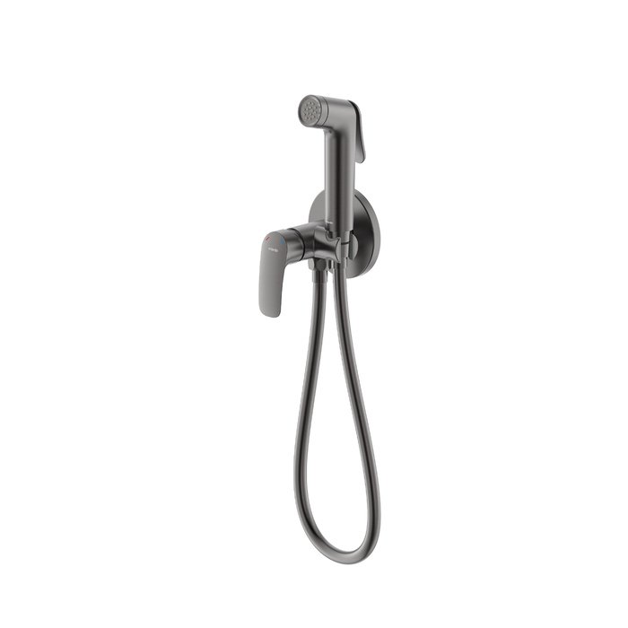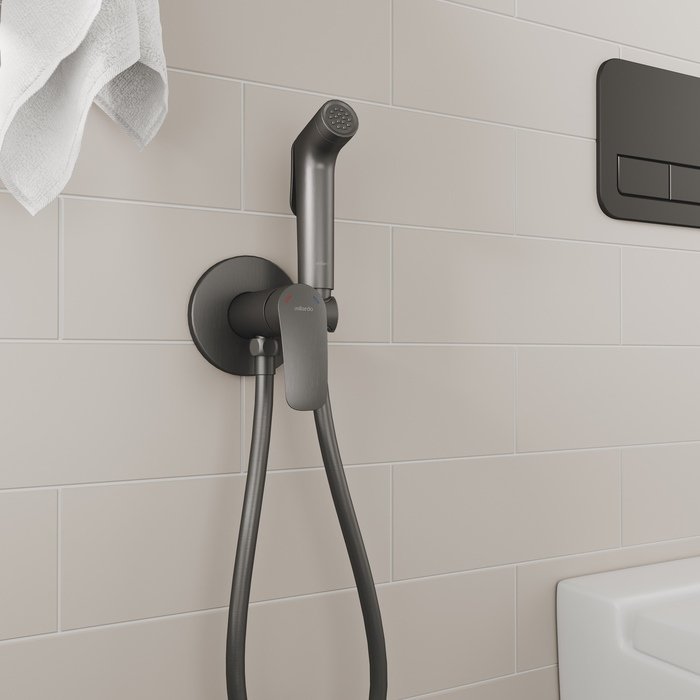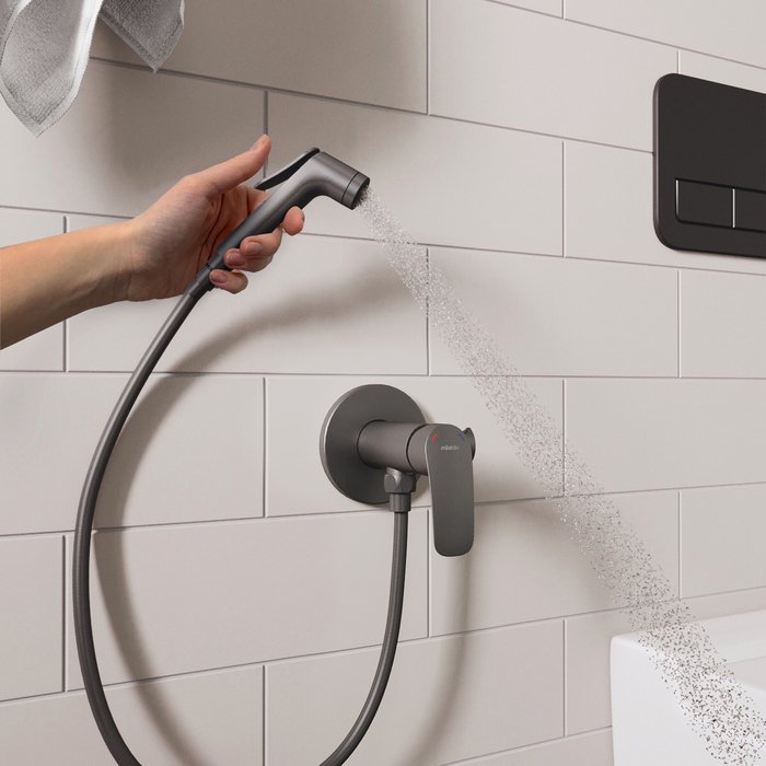 Смеситель с гигиеническим душем отличается универсальным характером: основной акцент в его дизайне приходится на плавные линии корпуса и трендовый графитовый цвет. Держатель для лейки интегрирован в компактный корпус смесителя – удобно для санузлов небольшой площади. Простой рычажный механизм – для управления смесителем в одно движение.