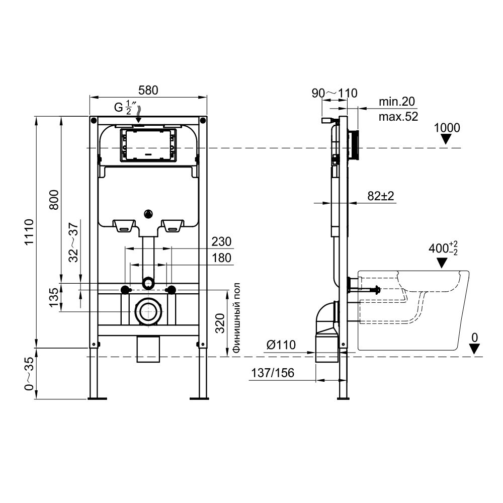 Рама инсталляции изготовлена из стали высокого качества и выдерживает нагрузку до 400 кг.