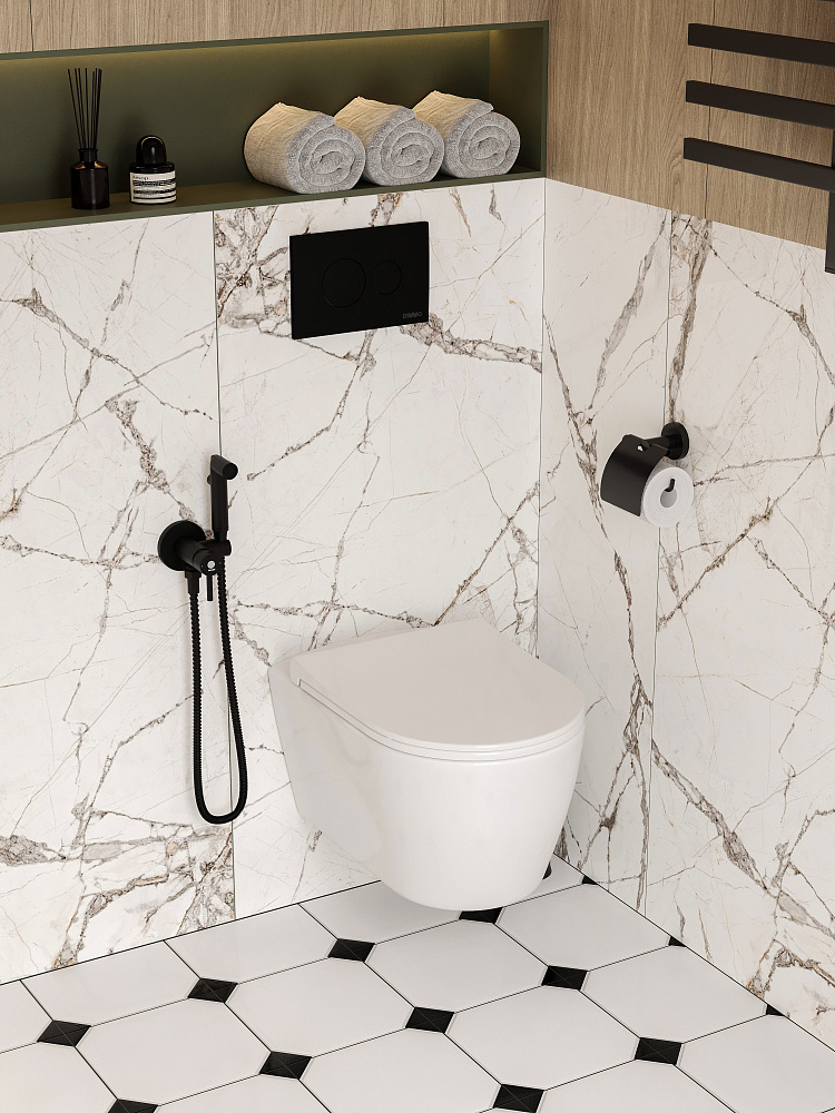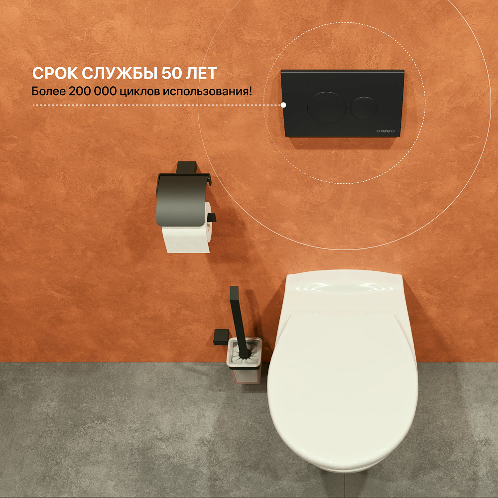 Эффектная кнопка смыва DIWO 7313 обладает впечатляющим дизайном. Черная матовая поверхность практична — на ней не остается следов пальцев. На передней панели, выполненной из прочного пластика, расположены две круглые клавиши. Внутри корпуса находится надежный механизм — более 200 000 циклов использования, что соответствует 50 годам службы. Также стоит отметить возможность быстрого демонтажа кнопки для удобного доступа и обслуживания. Модель совместима с инсталляцией для унитазов DIWO 4501.