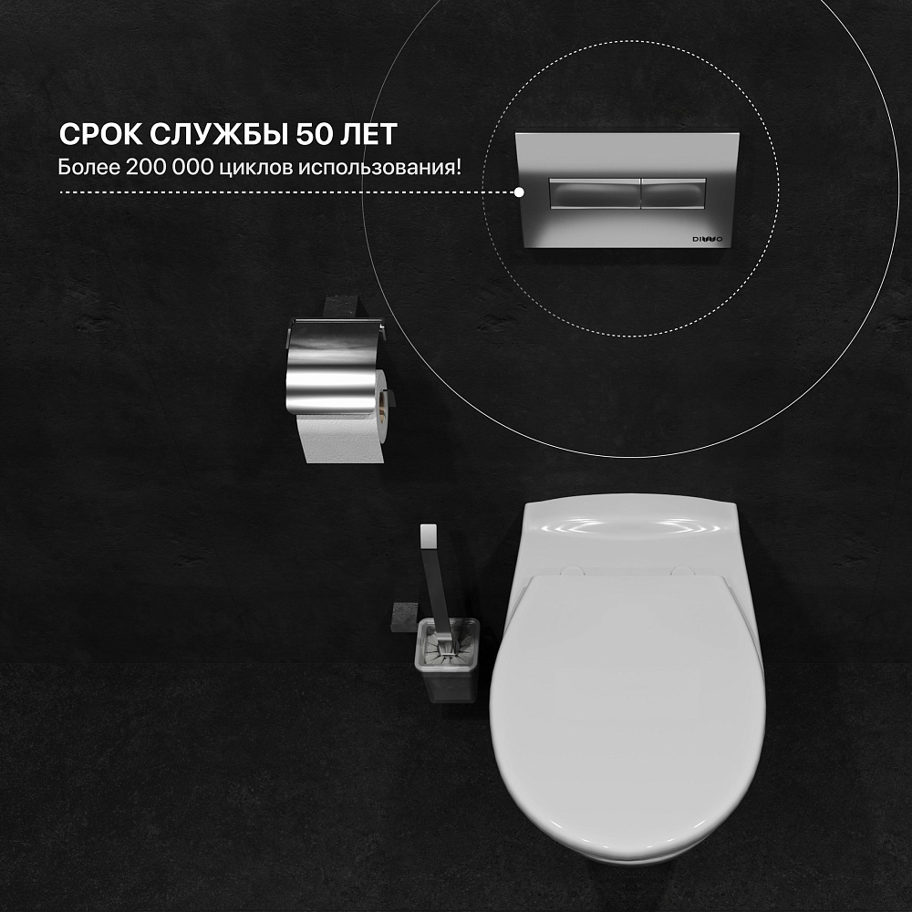 DIWO 7321 — лаконичная кнопка смыва, совместимая с инсталляцией для унитазов DIWO 4501. Передняя панель, изготовленная из прочного пластика в стильном оттенке «хром», оснащена двумя прямоугольными клавишами. На матовой поверхности не остается отпечатков пальцев. Кнопка может прослужить до 50 лет за счет надежного внутреннего механизма — это более 200 000 циклов использования. Возможность быстрого демонтажа кнопки обеспечит легкий доступ к коммуникациям в любое время.