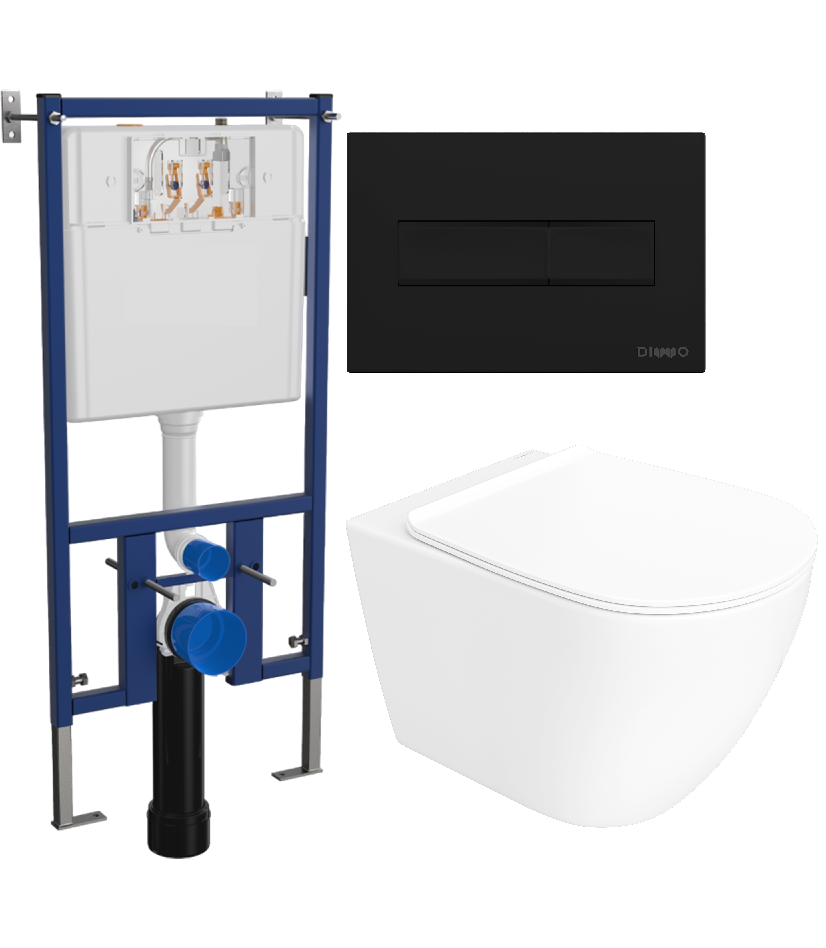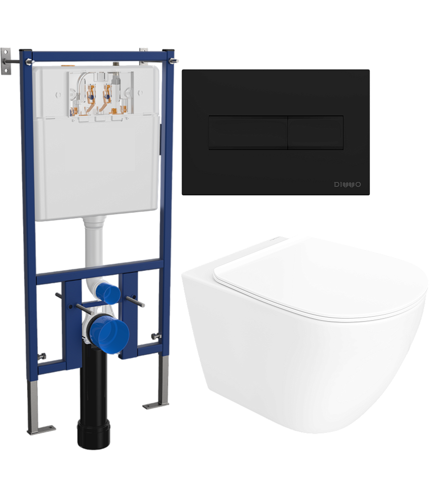 Комплект 3 в 1 Унитаз подвесной STWORKI Готланд S13401WH, безободковый, с микролифтом, глянцевый белый, антивсплеск + Инсталляция DIWO 4501 + Кнопка 7323 цвет матовый черный