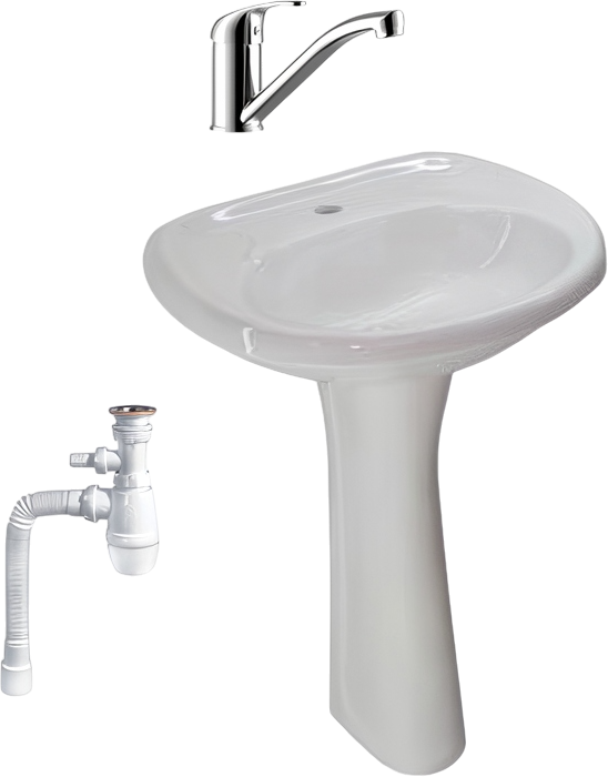 Комплект 4 в 1 Раковина Santeri Воротынский 1.3111.7.S00.10B.0 57 белая + Пьедестал 1.3601.7.S00.00B.0 глянцевый белый + Смеситель Rossinka Y + Сифон Wirquin Минор 30718052 бутылочный, белый