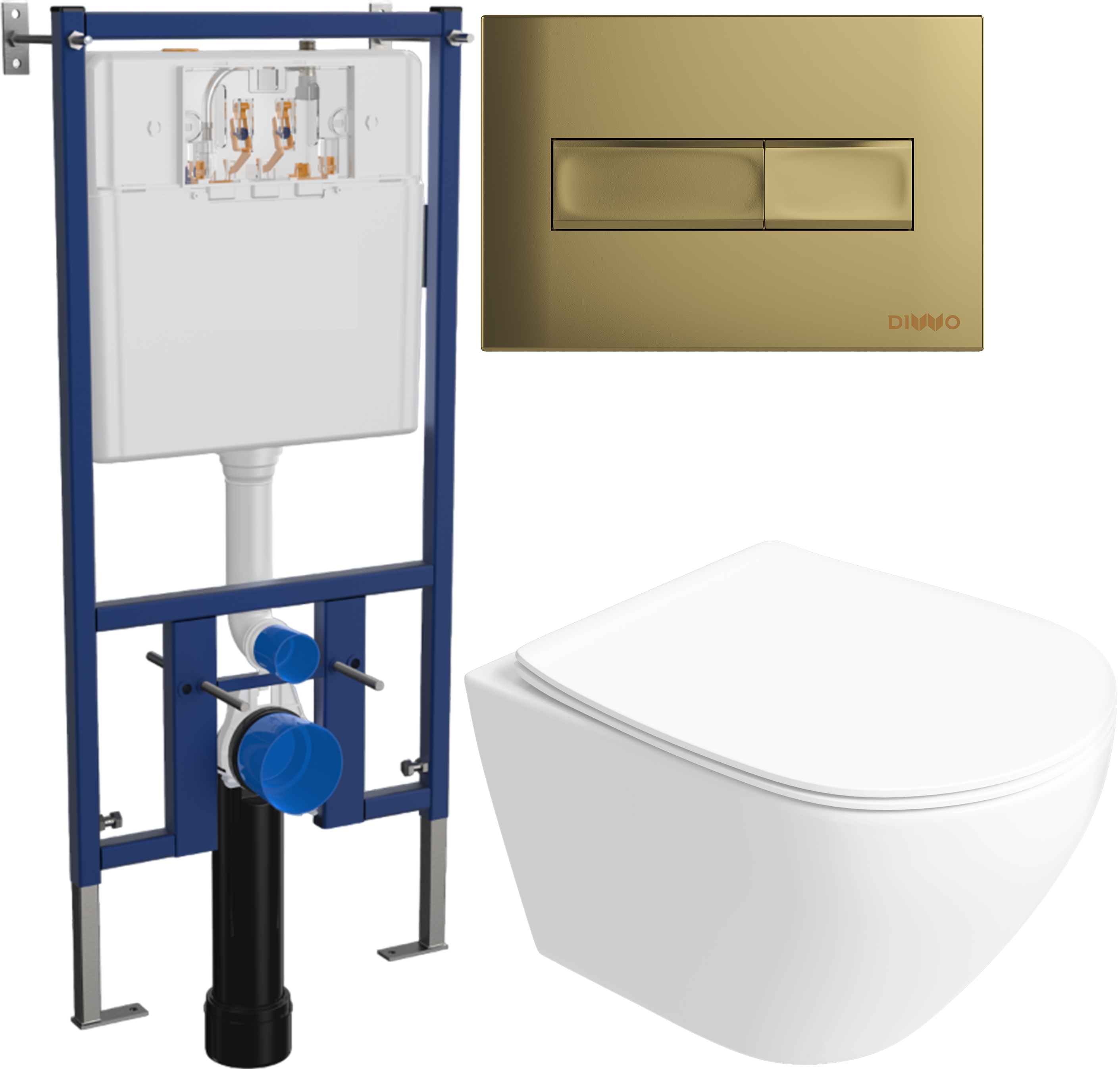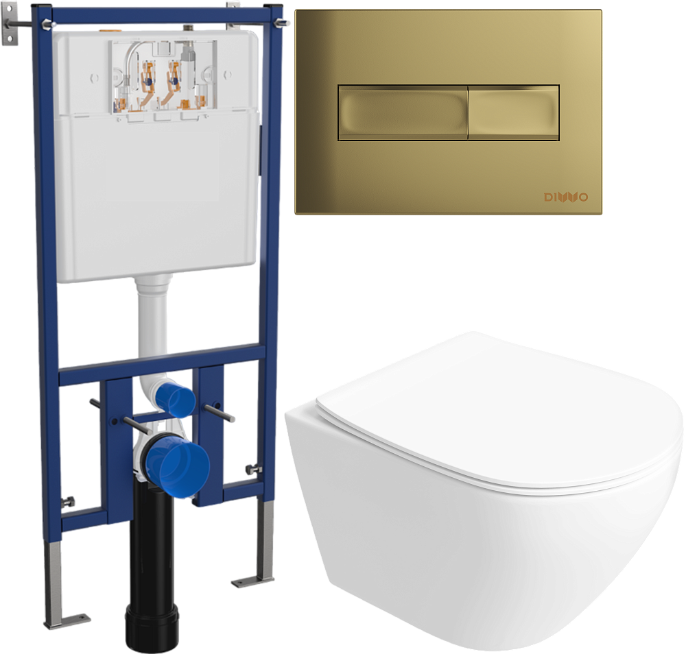 Комплект 6 в 1: Инсталляция DIWO 4501 + Унитаз подвесной Кронборг S28401WH безободковый + Сиденье с микролифтом + Кнопка 7325 золотая + Комплект шумоизоляции, креплений