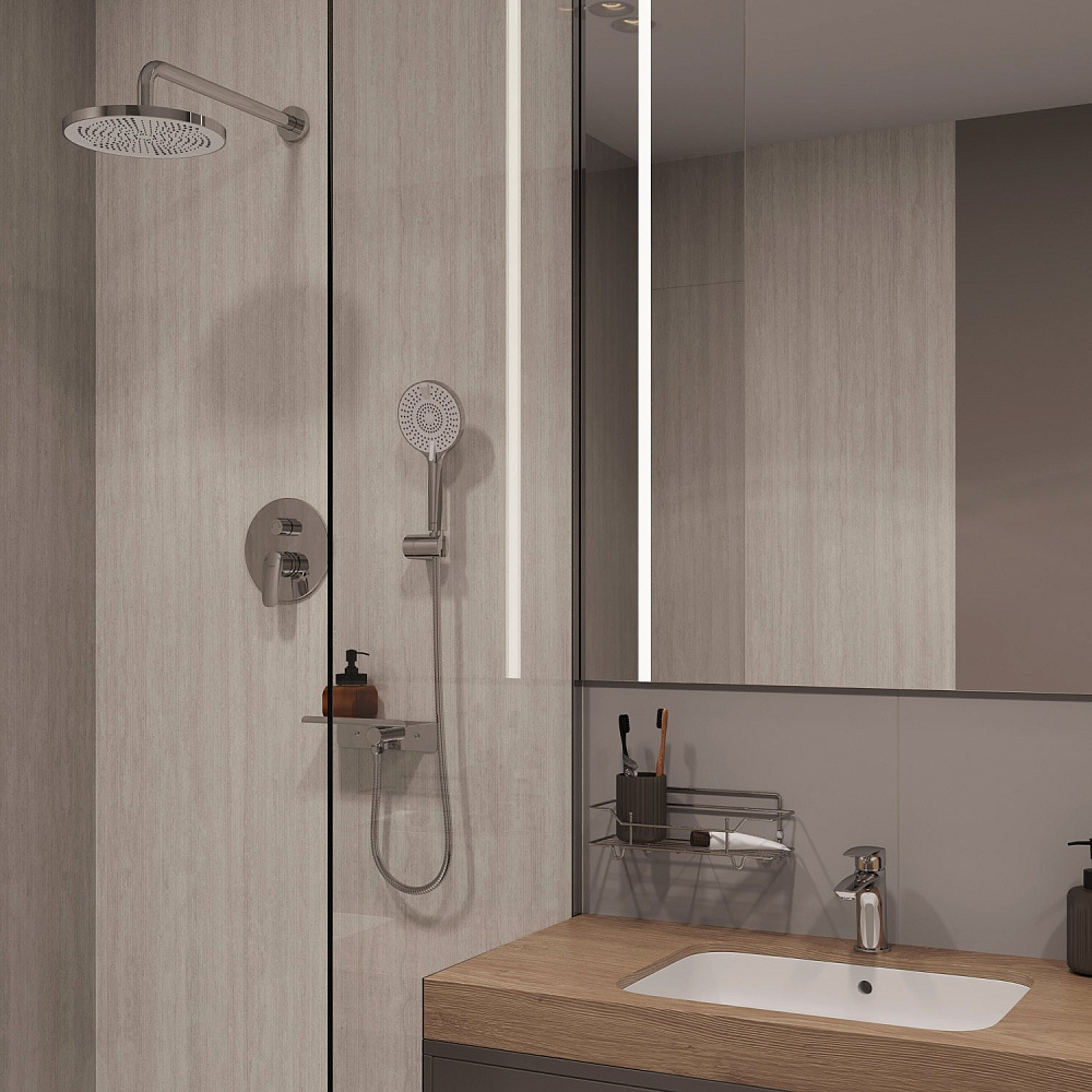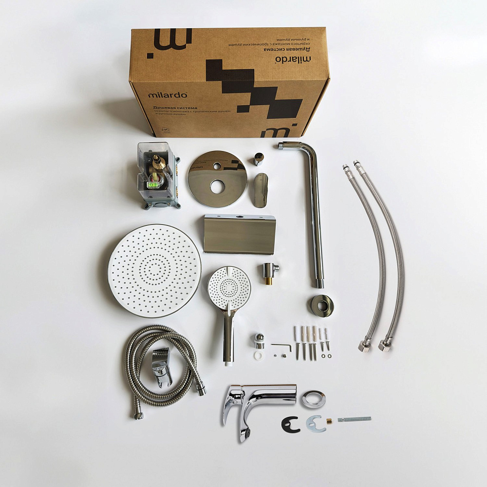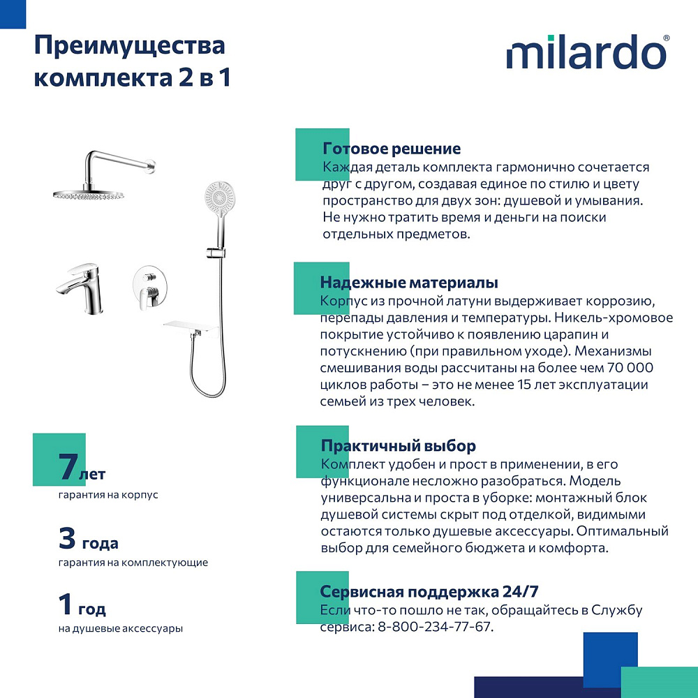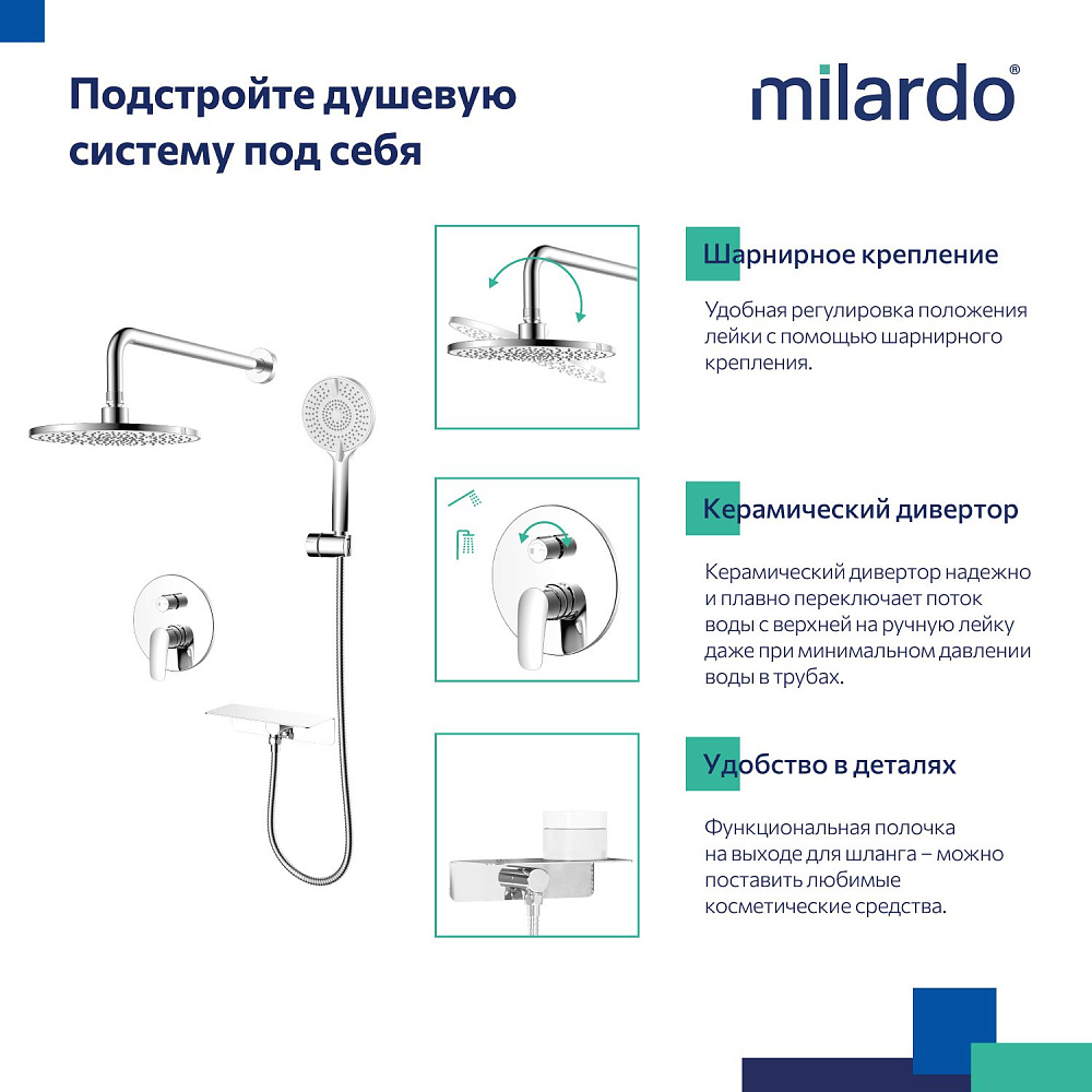 Комплект выполнен в современном дизайне и поддерживает эстетику минимализма: встраиваемый монтажный блок со всеми механизмами скрыт под отделкой, видимыми остаются только элементы управления и душевые аксессуары, имеющие классические округлые формы. Все это позволяет вписать сантехнику практически в любой интерьер. Встраиваемую душевую систему можно установить практически в любом удобном месте ванной комнаты, в том числе, на разных стенах. Конструкция и материал стен не имеют значения. А глубина установки регулируется – достаточно срезать выступающие гофрированные края. Пластиковый бокс защищает устройство подачи воды от внешнего воздействия, что продлевает срок службы душевой системы. Сантехнику без выступающих деталей проще поддерживать в чистоте. Подходит для систем с водой высокой температуры (70-80 °С) в трубах. Например, при эксплуатации с газовой колонкой. Отличная эргономика: благодаря продуманным пропорциям смесителя для умывальника и углу наклона аэратора струя воды падает в самую удобную точку умывальника. Матовое покрытие в черном цвете устойчиво к появлению царапин и выцветанию (при правильном уходе) – такая сантехника дольше сохранит свой первоначальный внешний вид. В комплекте есть все необходимое для использования сразу после установки: ПВХ-шланг (1,5 м) в оплетке из нержавеющей стали, четырехрежимная ручная лейка, тропический душ и полочка, интегрированная с выходом для шланга – на ней будет удобно разместить любимые косметические средства. Гарантия на душевую систему & смеситель Milardo® – 7 лет, на водозапорный механизм – 3 года, на душевые аксессуары – 1 год.