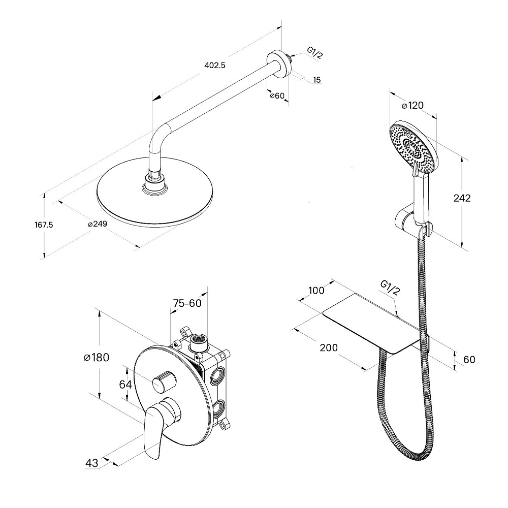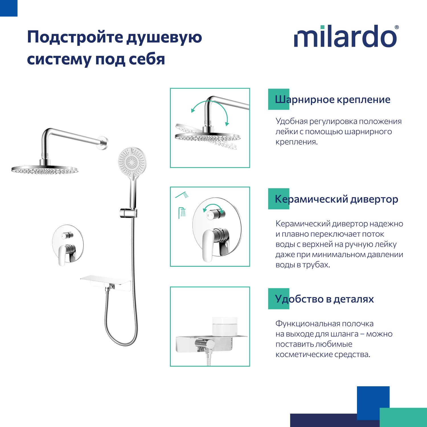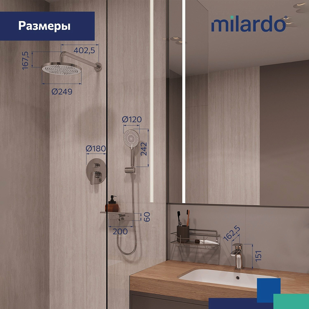 Комплект выполнен в современном дизайне и поддерживает эстетику минимализма: встраиваемый монтажный блок со всеми механизмами скрыт под отделкой, видимыми остаются только элементы управления и душевые аксессуары, имеющие классические округлые формы. Все это позволяет вписать сантехнику практически в любой интерьер. Встраиваемую душевую систему можно установить практически в любом удобном месте ванной комнаты, в том числе, на разных стенах. Конструкция и материал стен не имеют значения. А глубина установки регулируется – достаточно срезать выступающие гофрированные края. Пластиковый бокс защищает устройство подачи воды от внешнего воздействия, что продлевает срок службы душевой системы. Сантехнику без выступающих деталей проще поддерживать в чистоте. Подходит для систем с водой высокой температуры (70-80 °С) в трубах. Например, при эксплуатации с газовой колонкой. Отличная эргономика: благодаря продуманным пропорциям смесителя для умывальника и углу наклона аэратора струя воды падает в самую удобную точку умывальника. Матовое покрытие в черном цвете устойчиво к появлению царапин и выцветанию (при правильном уходе) – такая сантехника дольше сохранит свой первоначальный внешний вид. В комплекте есть все необходимое для использования сразу после установки: ПВХ-шланг (1,5 м) в оплетке из нержавеющей стали, четырехрежимная ручная лейка, тропический душ и полочка, интегрированная с выходом для шланга – на ней будет удобно разместить любимые косметические средства. Гарантия на душевую систему & смеситель Milardo® – 7 лет, на водозапорный механизм – 3 года, на душевые аксессуары – 1 год.