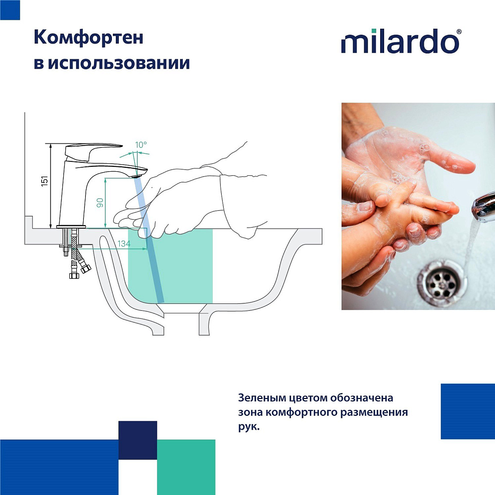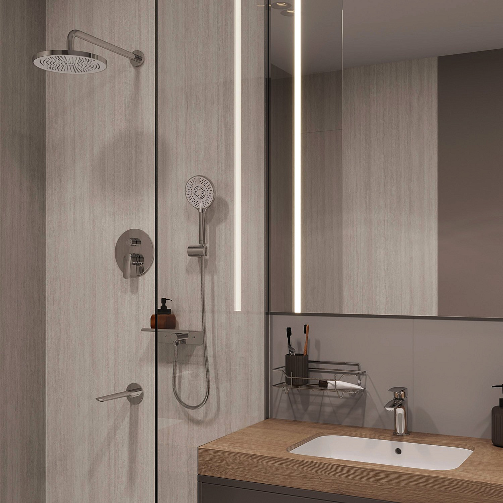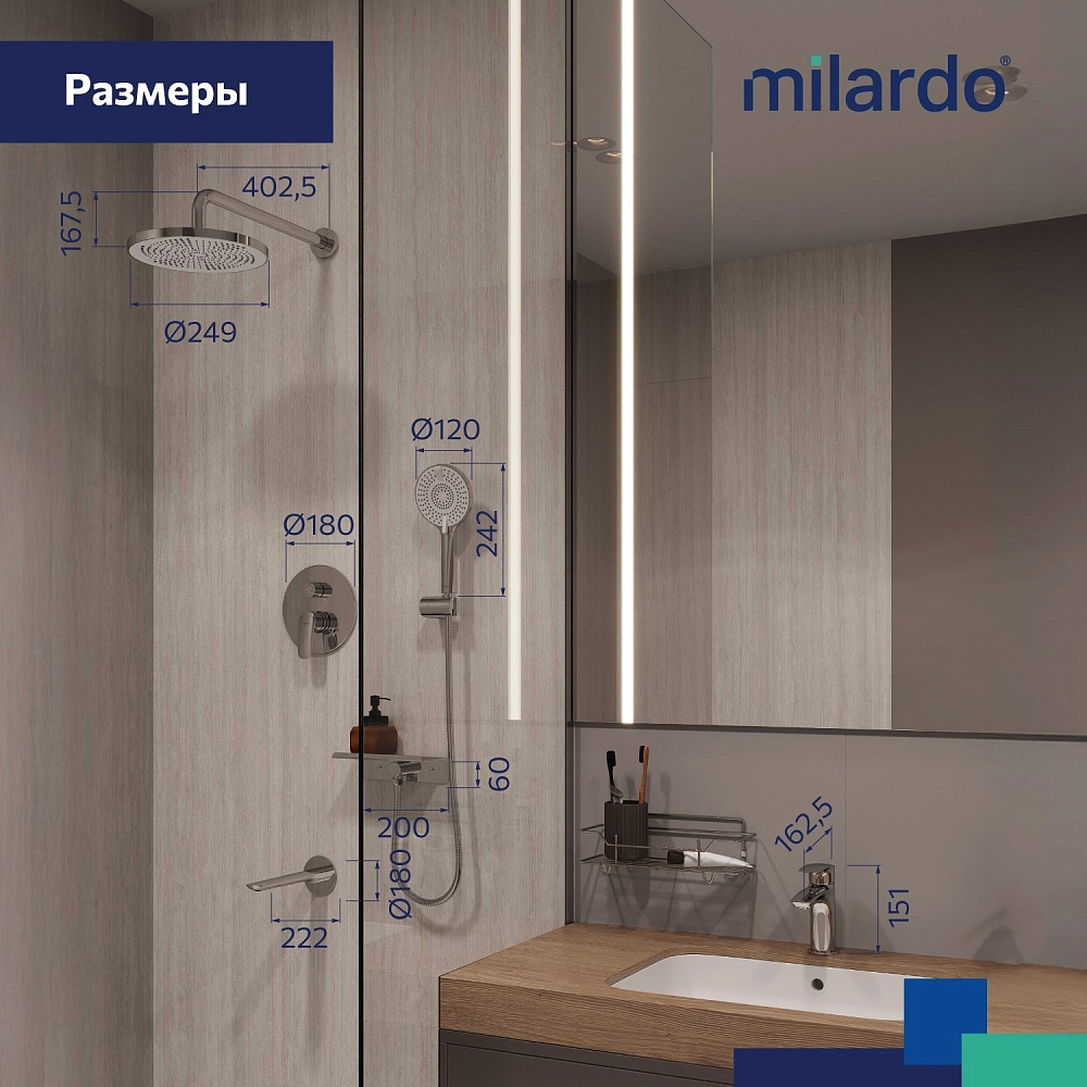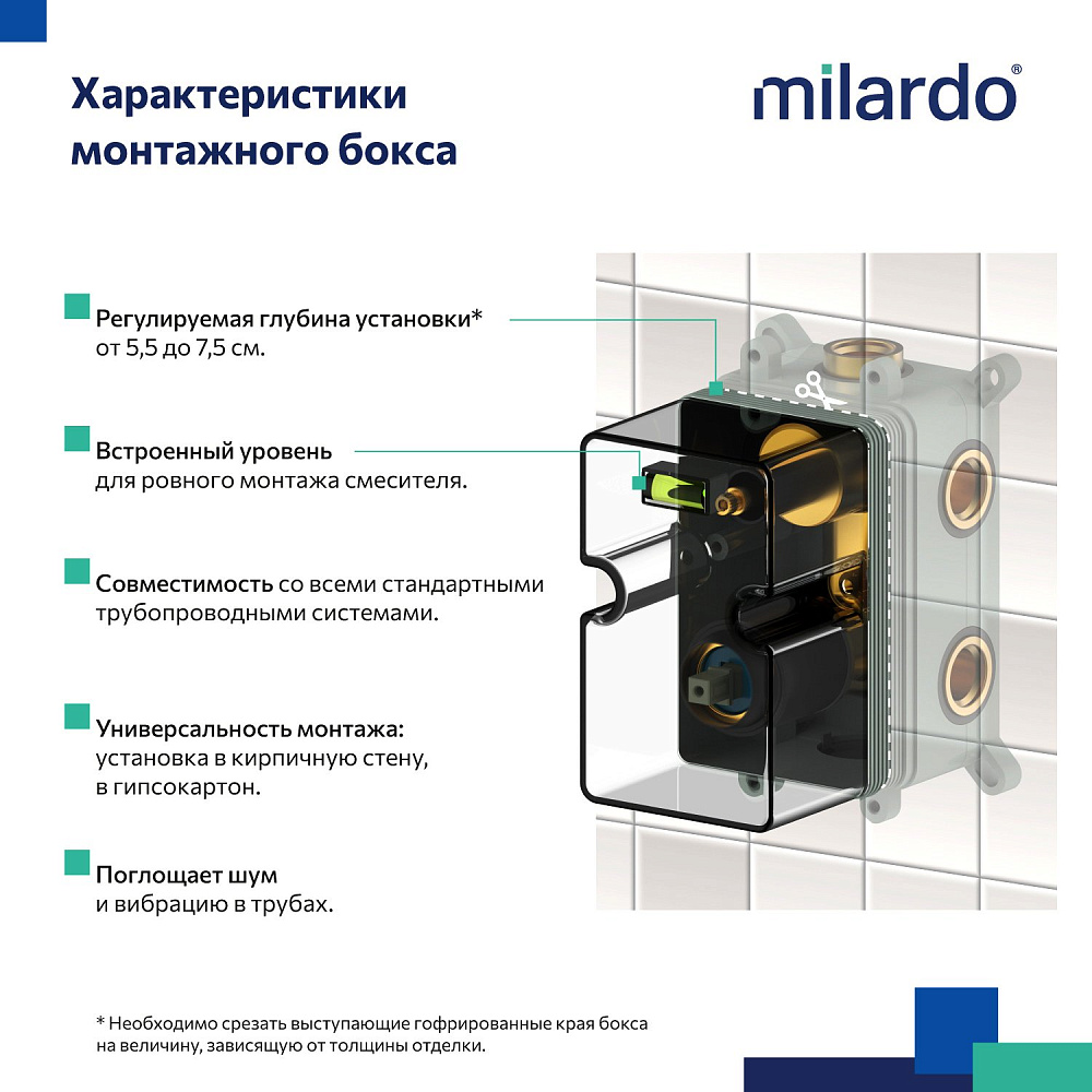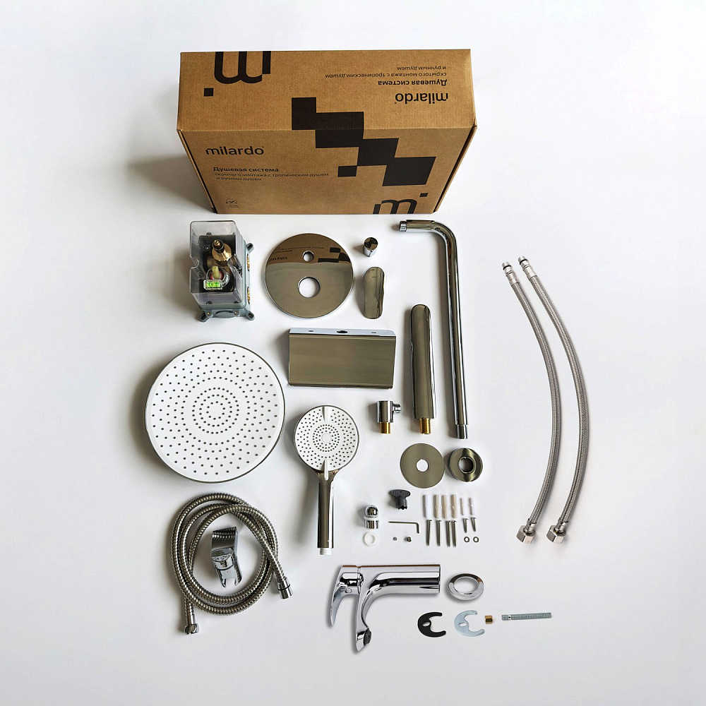 Комплект выполнен в современном дизайне и поддерживает эстетику минимализма: встраиваемый монтажный блок со всеми механизмами скрыт под отделкой, видимыми остаются только элементы управления и душевые аксессуары, имеющие классические округлые формы. Все это позволяет вписать сантехнику практически в любой интерьер. Встраиваемую душевую систему можно установить практически в любом удобном месте ванной комнаты, в том числе, на разных стенах. Конструкция и материал стен не имеют значения. А глубина установки регулируется – достаточно срезать выступающие гофрированные края. Пластиковый бокс защищает устройство подачи воды от внешнего воздействия, что продлевает срок службы душевой системы. Сантехнику без выступающих деталей проще поддерживать в чистоте. Подходит для систем с водой высокой температуры (70-80 °С) в трубах. Например, при эксплуатации с газовой колонкой. Отличная эргономика: благодаря продуманным пропорциям смесителя для умывальника и углу наклона аэратора струя воды падает в самую удобную точку умывальника. Матовое покрытие в черном цвете устойчиво к появлению царапин и выцветанию (при правильном уходе) – такая сантехника дольше сохранит свой первоначальный внешний вид. В комплекте есть все необходимое для использования сразу после установки: ПВХ-шланг (1,5 м) в оплетке из нержавеющей стали, четырехрежимная ручная лейка, тропический душ и полочка, интегрированная с выходом для шланга – на ней будет удобно разместить любимые косметические средства. Гарантия на душевую систему & смеситель Milardo® – 7 лет, на водозапорный механизм – 3 года, на душевые аксессуары – 1 год.