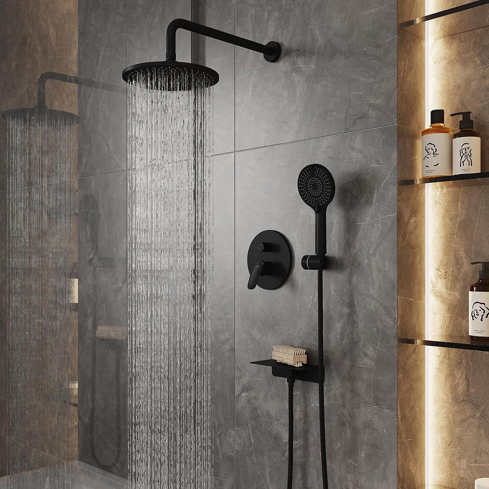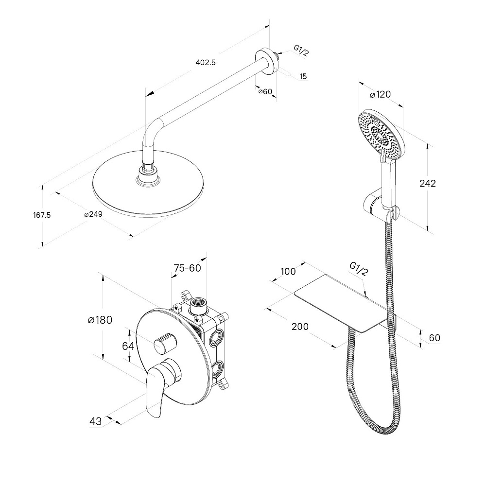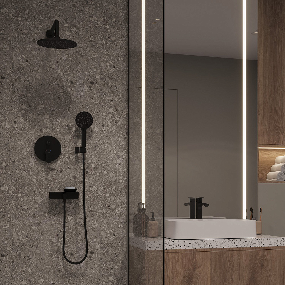 Комплект выполнен в современном дизайне и поддерживает эстетику минимализма: встраиваемый монтажный блок со всеми механизмами скрыт под отделкой, видимыми остаются только элементы управления и душевые аксессуары, имеющие классические округлые формы. Все это позволяет вписать сантехнику практически в любой интерьер.