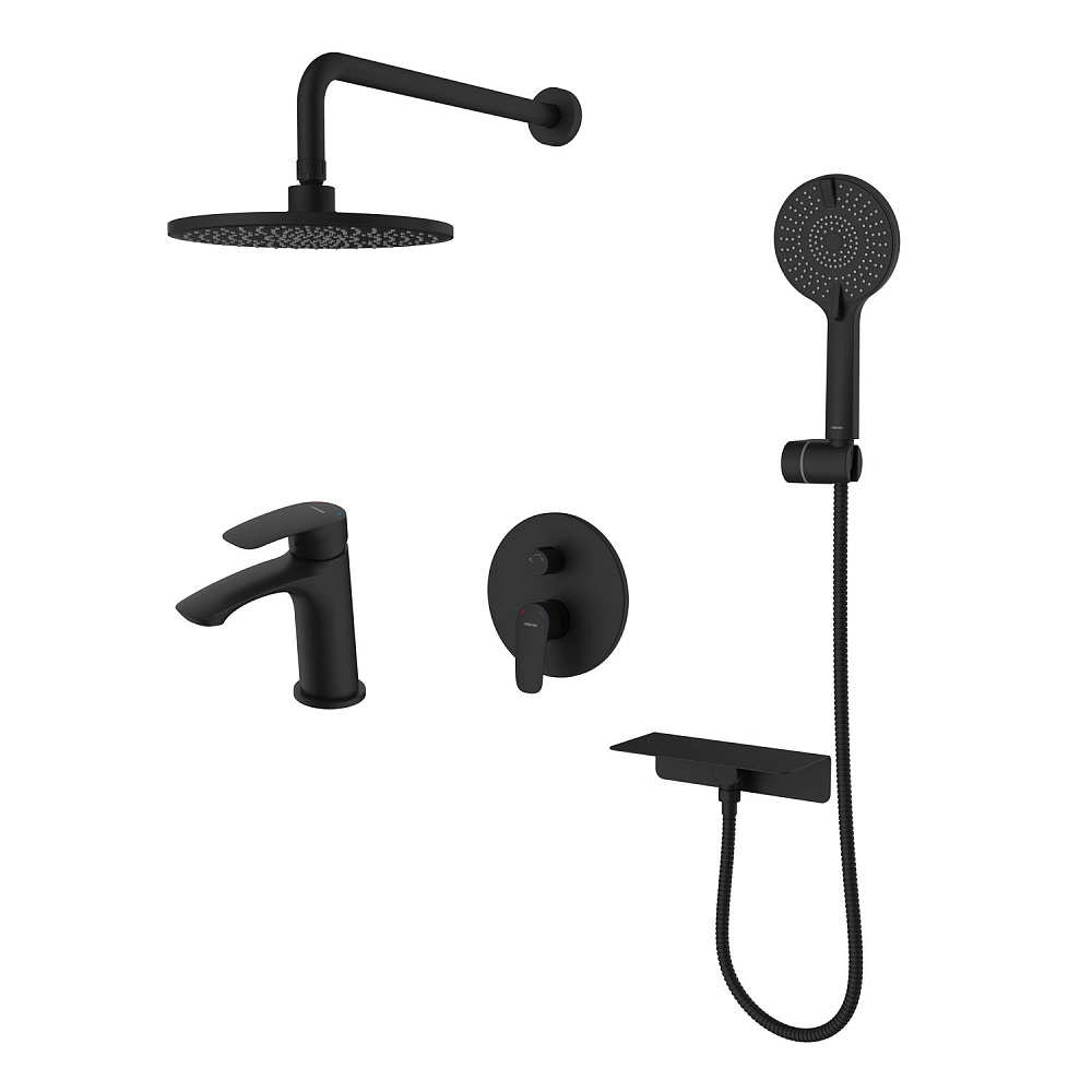 • В комплекте есть все необходимое для использования сразу после установки: ПВХ-шланг (1,5 м) в оплетке из нержавеющей стали, четырехрежимная ручная лейка, тропический душ и полочка, интегрированная с выходом для шланга – на ней будет удобно разместить любимые косметические средства.
