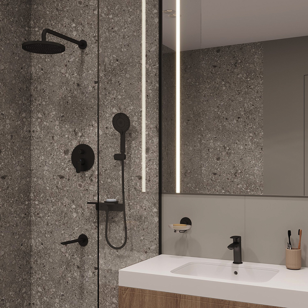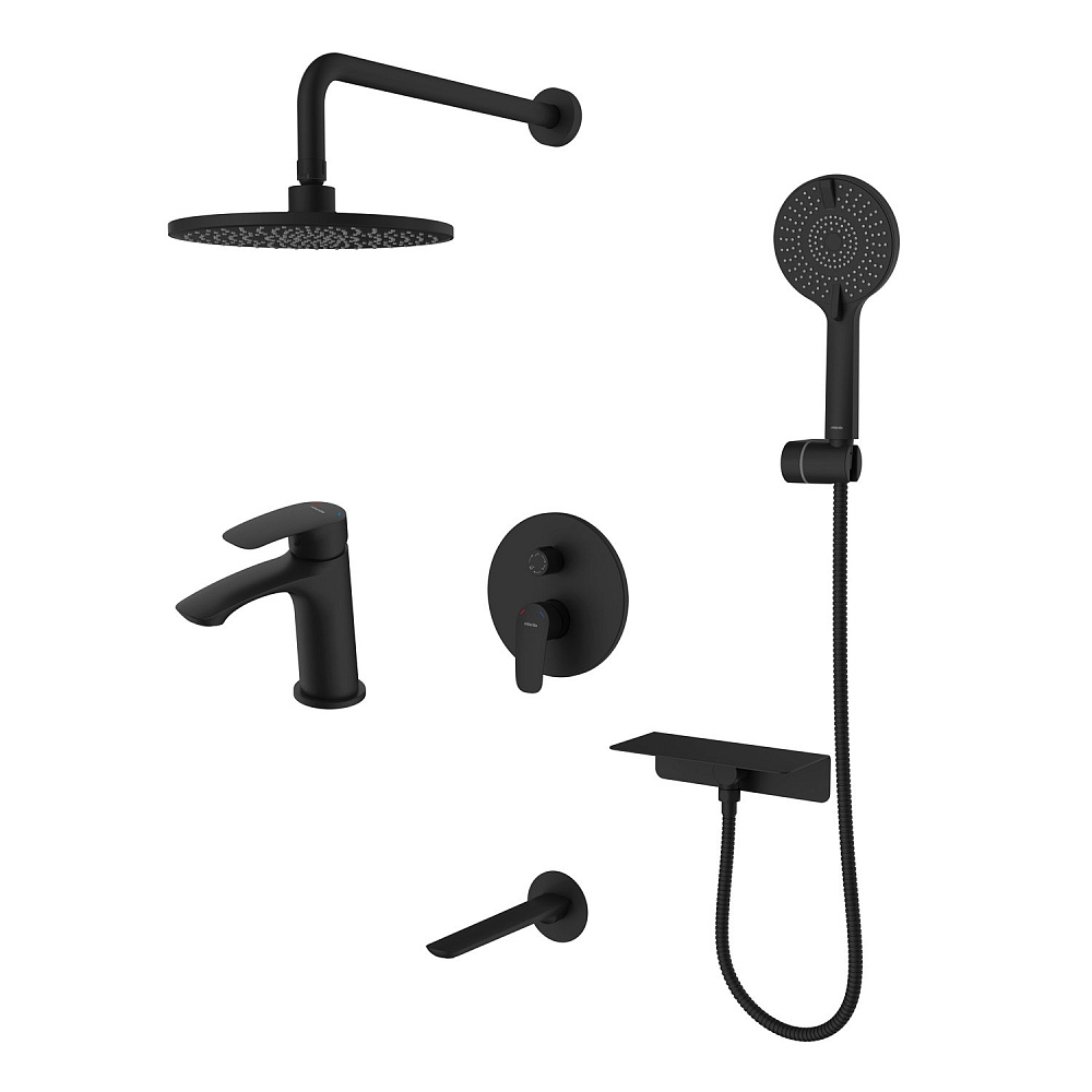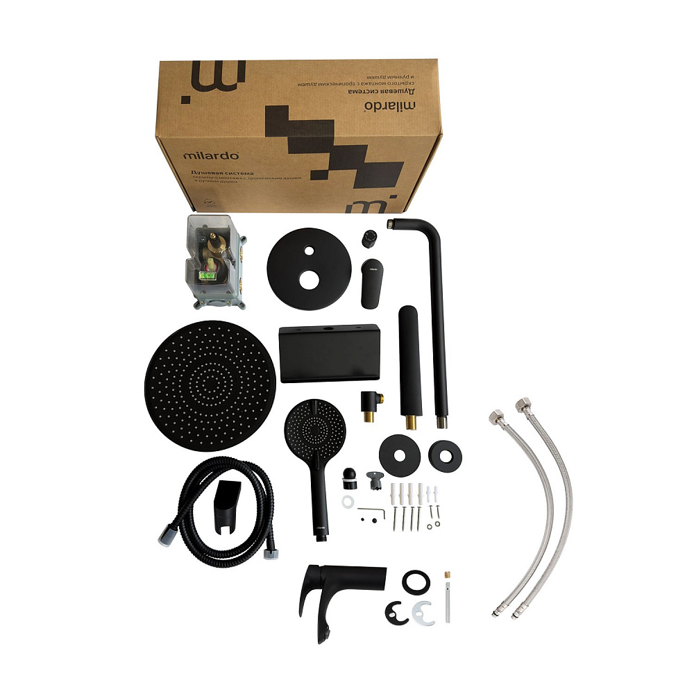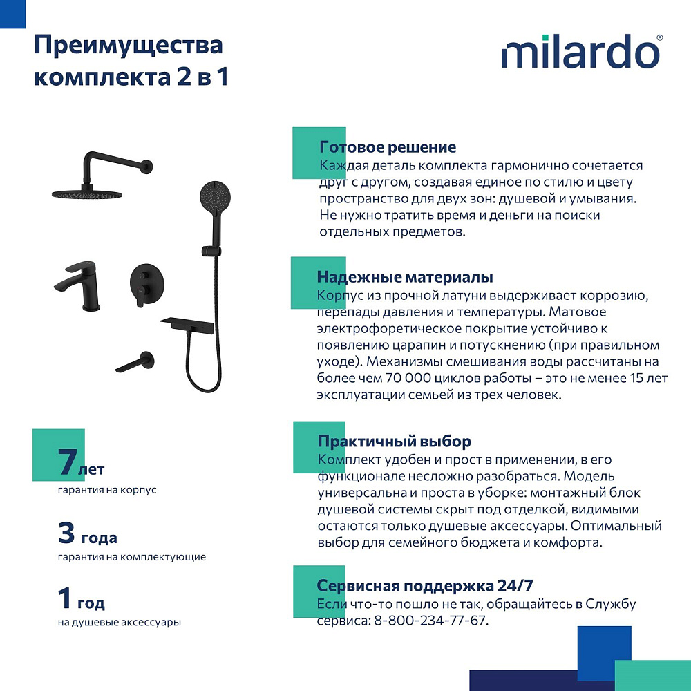 Комплект выполнен в современном дизайне и поддерживает эстетику минимализма: встраиваемый монтажный блок со всеми механизмами скрыт под отделкой, видимыми остаются только элементы управления и душевые аксессуары, имеющие классические округлые формы. Все это позволяет вписать сантехнику практически в любой интерьер. Встраиваемую душевую систему можно установить практически в любом удобном месте ванной комнаты, в том числе, на разных стенах. Конструкция и материал стен не имеют значения. А глубина установки регулируется – достаточно срезать выступающие гофрированные края. Пластиковый бокс защищает устройство подачи воды от внешнего воздействия, что продлевает срок службы душевой системы. Сантехнику без выступающих деталей проще поддерживать в чистоте. Подходит для систем с водой высокой температуры (70-80 °С) в трубах. Например, при эксплуатации с газовой колонкой. Отличная эргономика: благодаря продуманным пропорциям смесителя для умывальника и углу наклона аэратора струя воды падает в самую удобную точку умывальника. Матовое покрытие в черном цвете устойчиво к появлению царапин и выцветанию (при правильном уходе) – такая сантехника дольше сохранит свой первоначальный внешний вид. В комплекте есть все необходимое для использования сразу после установки: ПВХ-шланг (1,5 м) в оплетке из нержавеющей стали, четырехрежимная ручная лейка, тропический душ и полочка, интегрированная с выходом для шланга – на ней будет удобно разместить любимые косметические средства. Гарантия на душевую систему & смеситель Milardo® – 7 лет, на водозапорный механизм – 3 года, на душевые аксессуары – 1 год.