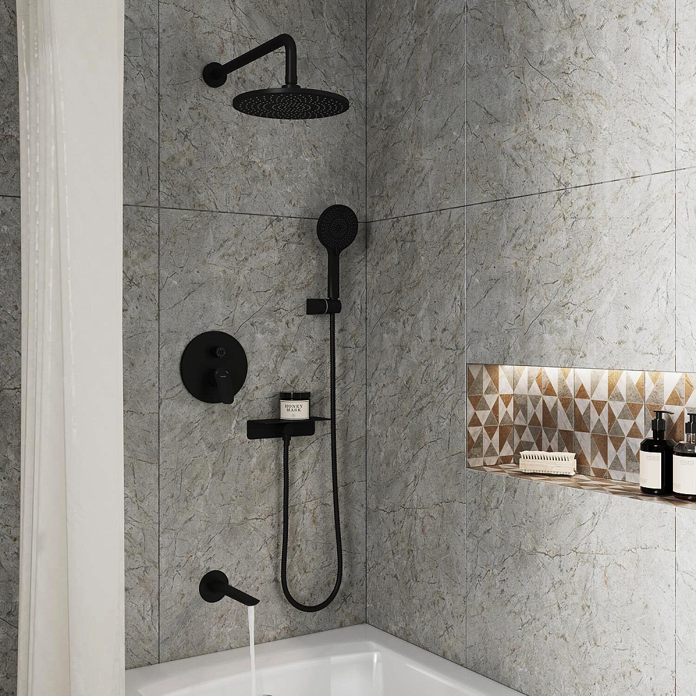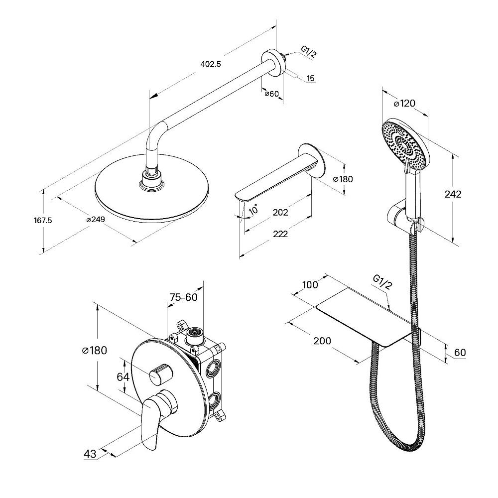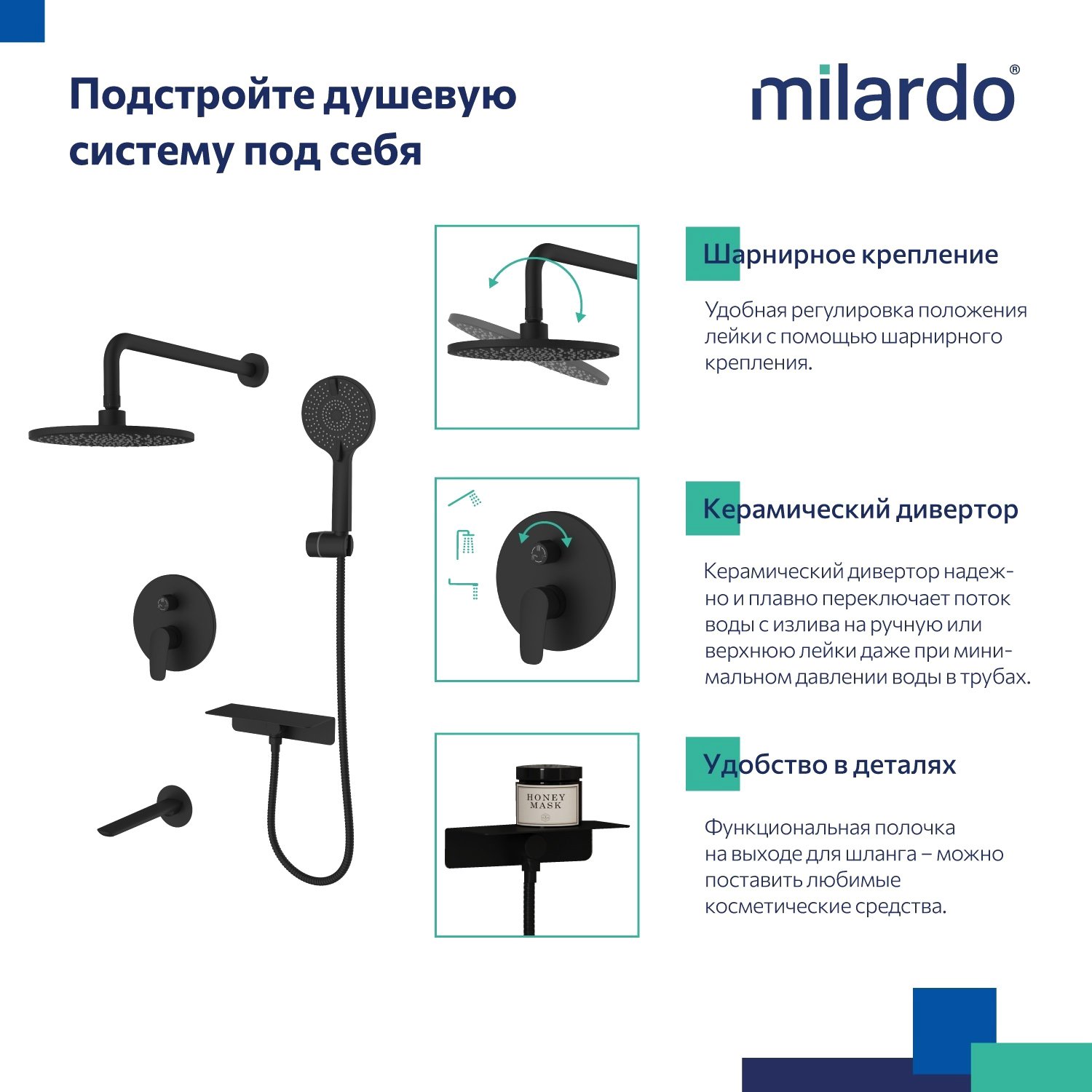 Комплект выполнен в современном дизайне и поддерживает эстетику минимализма: встраиваемый монтажный блок со всеми механизмами скрыт под отделкой, видимыми остаются только элементы управления и душевые аксессуары, имеющие классические округлые формы. Все это позволяет вписать сантехнику практически в любой интерьер. Встраиваемую душевую систему можно установить практически в любом удобном месте ванной комнаты, в том числе, на разных стенах. Конструкция и материал стен не имеют значения. А глубина установки регулируется – достаточно срезать выступающие гофрированные края. Пластиковый бокс защищает устройство подачи воды от внешнего воздействия, что продлевает срок службы душевой системы. Сантехнику без выступающих деталей проще поддерживать в чистоте. Подходит для систем с водой высокой температуры (70-80 °С) в трубах. Например, при эксплуатации с газовой колонкой. Отличная эргономика: благодаря продуманным пропорциям смесителя для умывальника и углу наклона аэратора струя воды падает в самую удобную точку умывальника. Матовое покрытие в черном цвете устойчиво к появлению царапин и выцветанию (при правильном уходе) – такая сантехника дольше сохранит свой первоначальный внешний вид. В комплекте есть все необходимое для использования сразу после установки: ПВХ-шланг (1,5 м) в оплетке из нержавеющей стали, четырехрежимная ручная лейка, тропический душ и полочка, интегрированная с выходом для шланга – на ней будет удобно разместить любимые косметические средства. Гарантия на душевую систему & смеситель Milardo® – 7 лет, на водозапорный механизм – 3 года, на душевые аксессуары – 1 год.