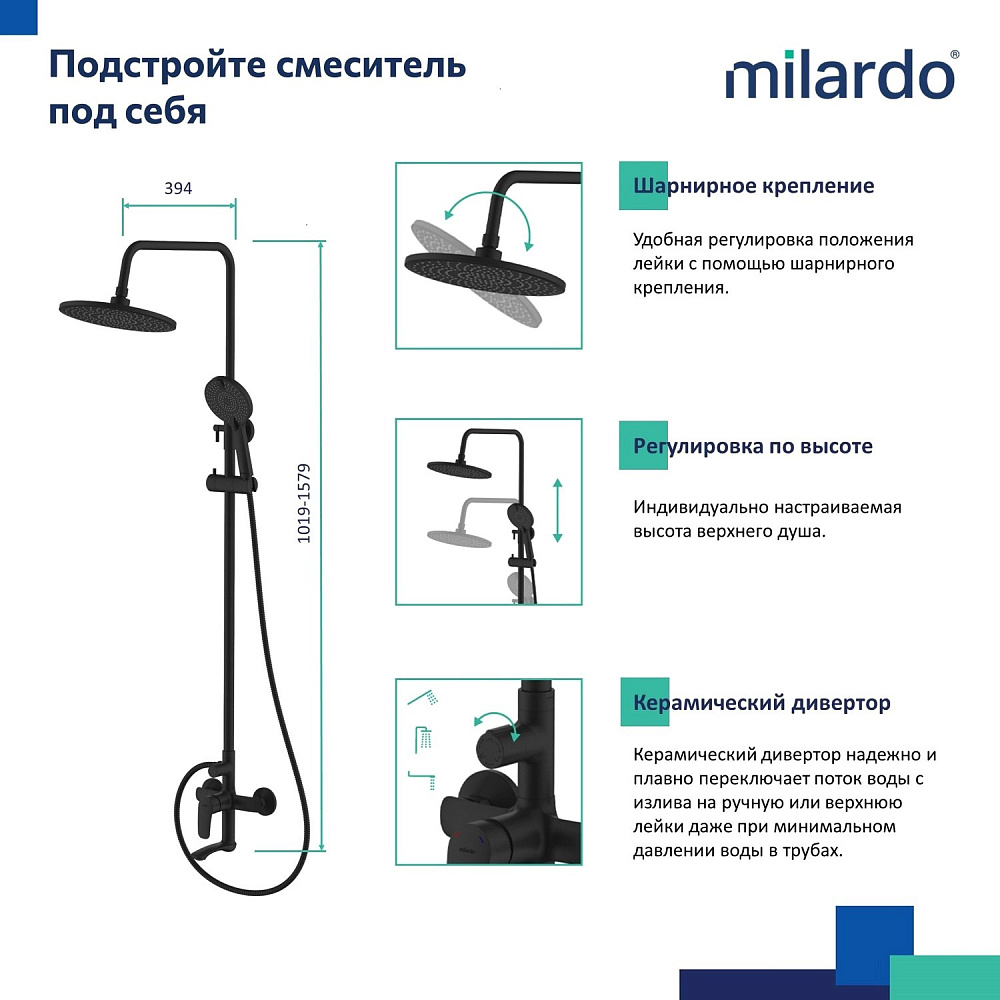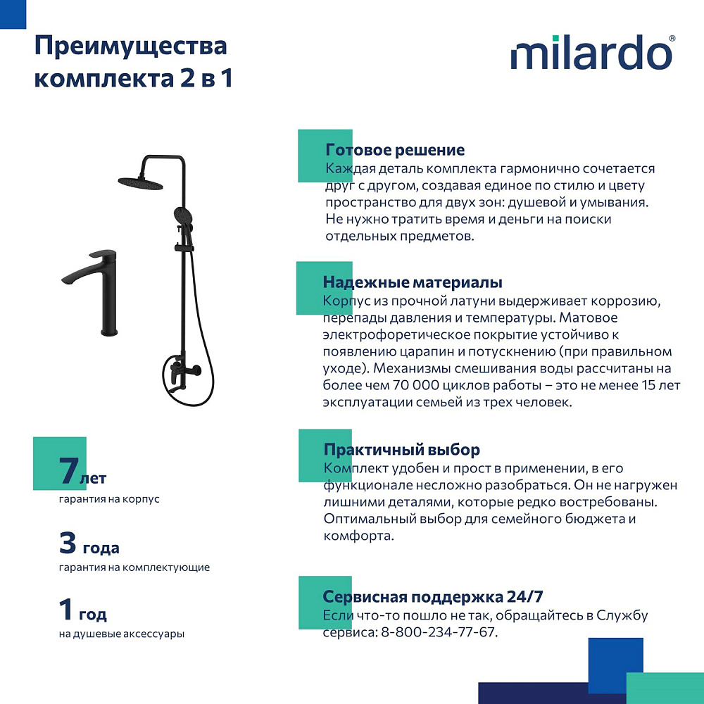 • Гарантия на душевую систему & смеситель Milardo® – 7 лет, на водозапорный механизм – 3 года, на душевые аксессуары – 1 год.