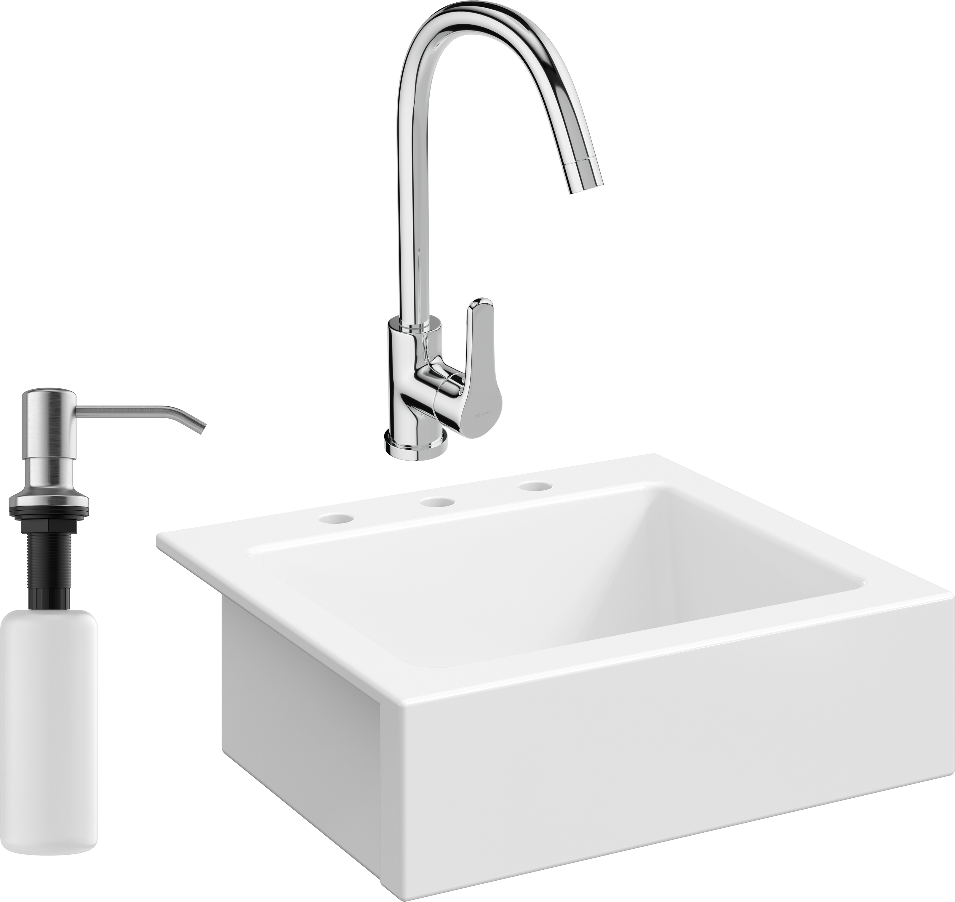 Комплект Мойка Domaci Сиена 50166-101, с 3 отверстиями, белый глянец + Смеситель Ливорно + Дозатор Равенна 401, сатин