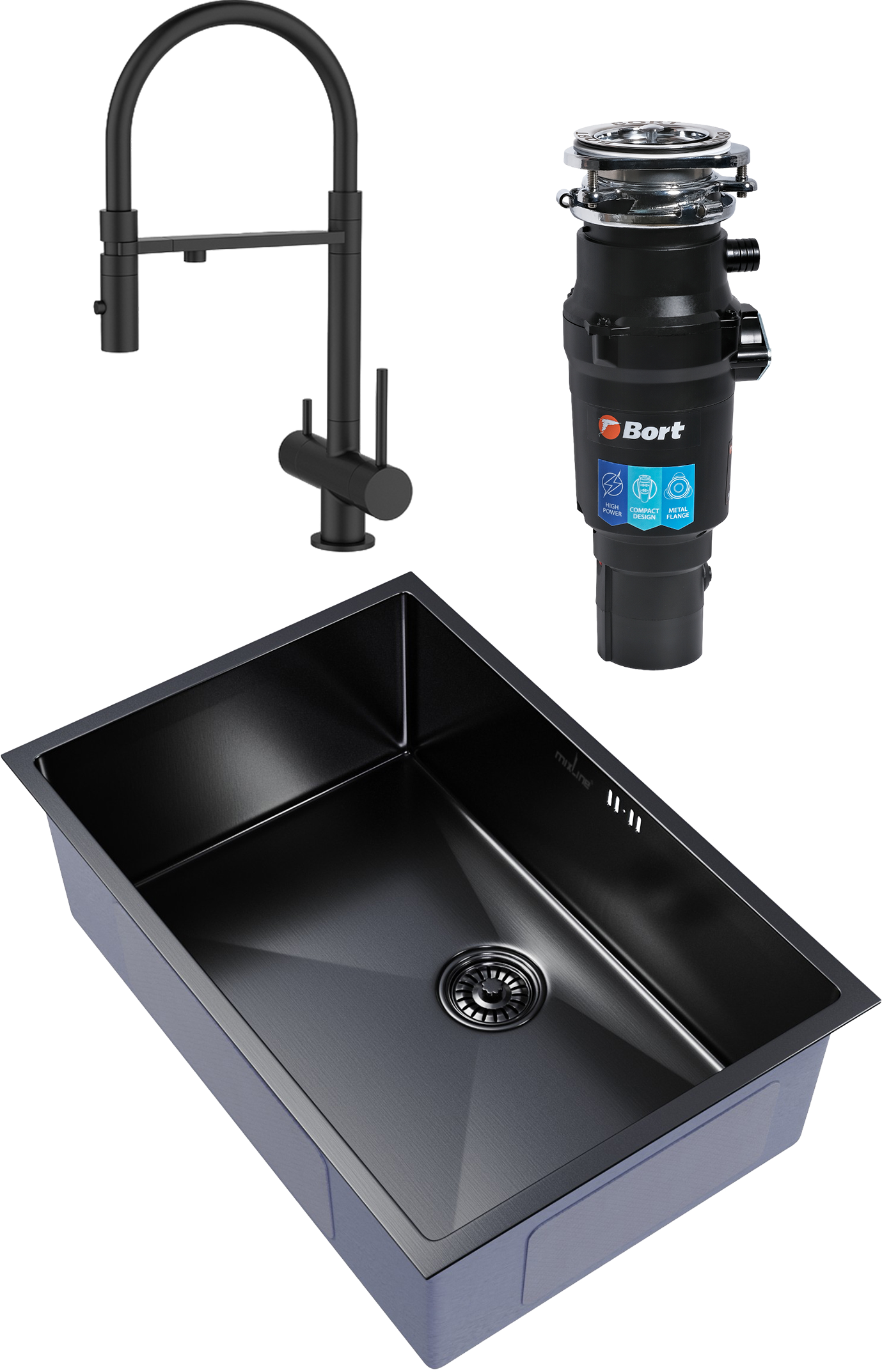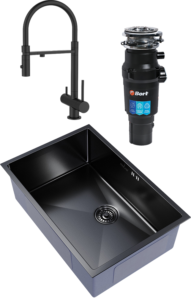 Комплект «Мойка кухонная Mixline 548573 чёрный графит + Смеситель IDDIS Ace ACEBLFFi05 чёрный матовый, с гибким изливом + Измельчитель Bort Titan 7000» — это идеальное решение для вашей кухни. Кухонная мойка Mixline Pro изготовлена сварным способом, что позволяет изготовить мойку с увеличенной глубиной чаши и более чёткими гранями. При изготовлении врезной кухонной мойки используется качественная нержавеющая сталь, которая придаёт изделию отличные прочностные свойства, устойчивость к окислению и к повышенной температуре. Покрытие мойки уникально тем, что парообразный металл впитывается в поверхность на молекулярном уровне и образует микрослой на поверхности. Это защищает от отслоения покрытия при сильном механическом воздействии на мойку или ударе. Царапины не оставят явного визуального следа, так как будут иметь тот же цвет, что и изделие. Магнитный замок надёжно фиксирует излив после использования, обеспечивая долговечность и надёжность конструкции. Корпус смесителя изготовлен из прочной латуни, стойкой к коррозии, резким изменениям давления и перепадам температуры воды. Излив из термостойкого силикона прост в содержании — его гладкая поверхность и высокая устойчивость к грибку делают уход за ним лёгким и приятным. Материал приятен на ощупь и легко моется обычным моющим средством. В смесителе предусмотрено 2 режима подачи воды: «душ» — для ополаскивания посуды или мытья овощей и фруктов; стандартная аэрированная струя — для быстрого наполнения ёмкостей. Переключение между режимами производится простым нажатием кнопки на изливе. Измельчитель Bort Titan 7000 станет незаменимым помощником на вашей кухне. Он легко справится с любыми продуктами, превратив их в однородную массу. Это позволит вам сэкономить время и силы при приготовлении пищи. Этот комплект — это не просто набор сантехники, это продуманное решение для вашей кухни, которое сделает вашу жизнь проще и комфортнее.