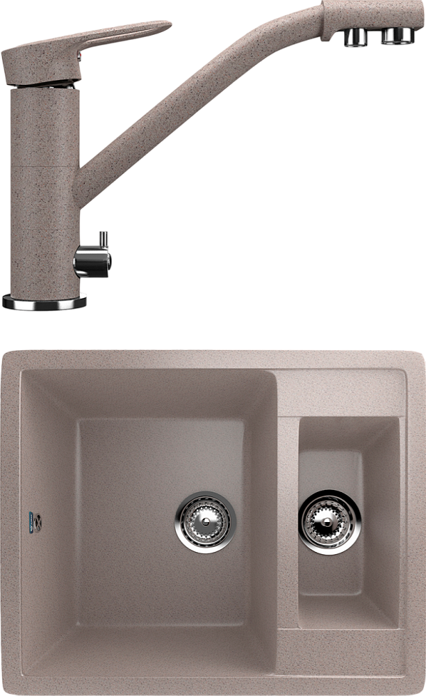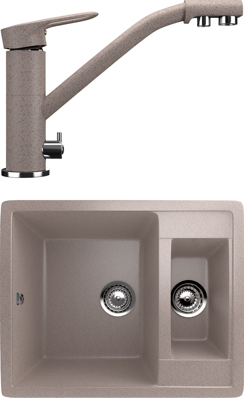 Комплект мойки кухонной Ulgran U-106 -302 песочная и смесителя U-010 -302 песочный — идеальное решение для вашей кухни. В его состав входит надёжная и долговечная мойка из искусственного мрамора, которая в несколько раз прочнее натурального камня. Этот материал устойчив к износу и отлично выдерживает перепады температуры, что делает его идеальным выбором для кухонной зоны. Двухконтурная чаша мойки имеет шероховатое дно и гладкие стенки, что обеспечивает хороший запас прочности и удобство в использовании. Благодаря своей конструкции, мойка легко чистится и не боится воздействия бытовой химии, сохраняя свой первозданный внешний вид на протяжении долгого времени. Смеситель, входящий в комплект, предназначен для подачи проточной и питьевой воды по раздельным каналам с аэраторами. Это позволяет избежать необходимости установки дополнительного оборудования и обеспечивает удобство и гигиеничность использования. Изготовленный из латуни, экологически чистого материала с великолепными эксплуатационными характеристиками, смеситель обладает высокой прочностью и долговечностью. Влагостойкое покрытие защищает его от коррозии и механических воздействий, гарантируя долгий срок службы. Этот комплект станет не только функциональным дополнением к вашей кухне, но и стильным акцентом, который подчеркнёт её современный дизайн. Песочный цвет мойки и смесителя гармонично впишется в любой интерьер, придавая ему особый шарм и уют.