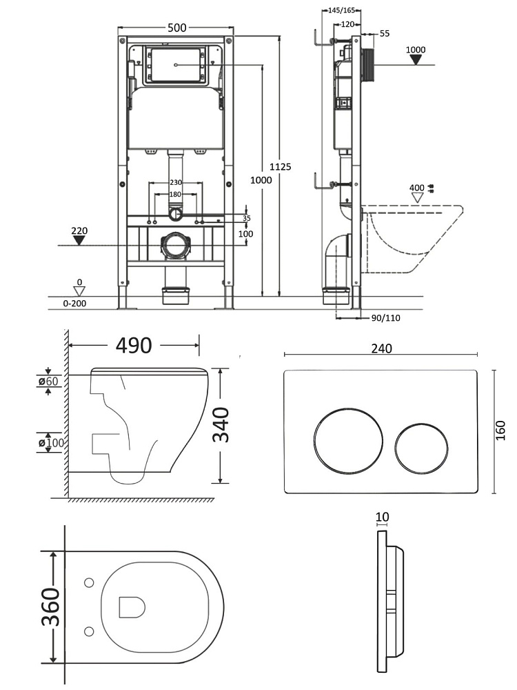 Комплект Orange CI07-100W+APB188 Унитаз подвесной безободковый, с микролифтом + Система инсталляции + Кнопка смыва белая